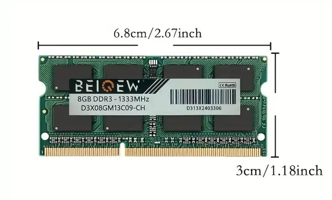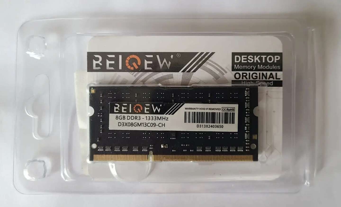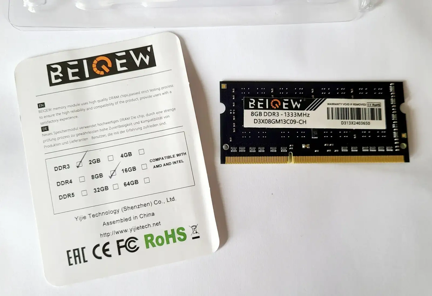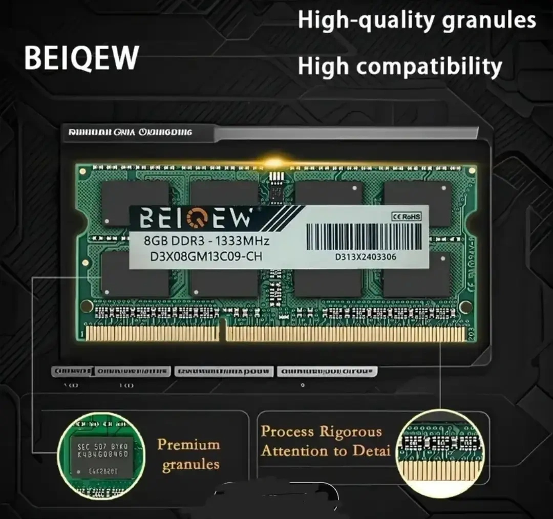 Brand: Beiqew; Type of product: DDR3; Capacity: 8 GB; Memory speed: 1333 MHz; Voltage: 1.35V; Memory format: SO-DIMM;