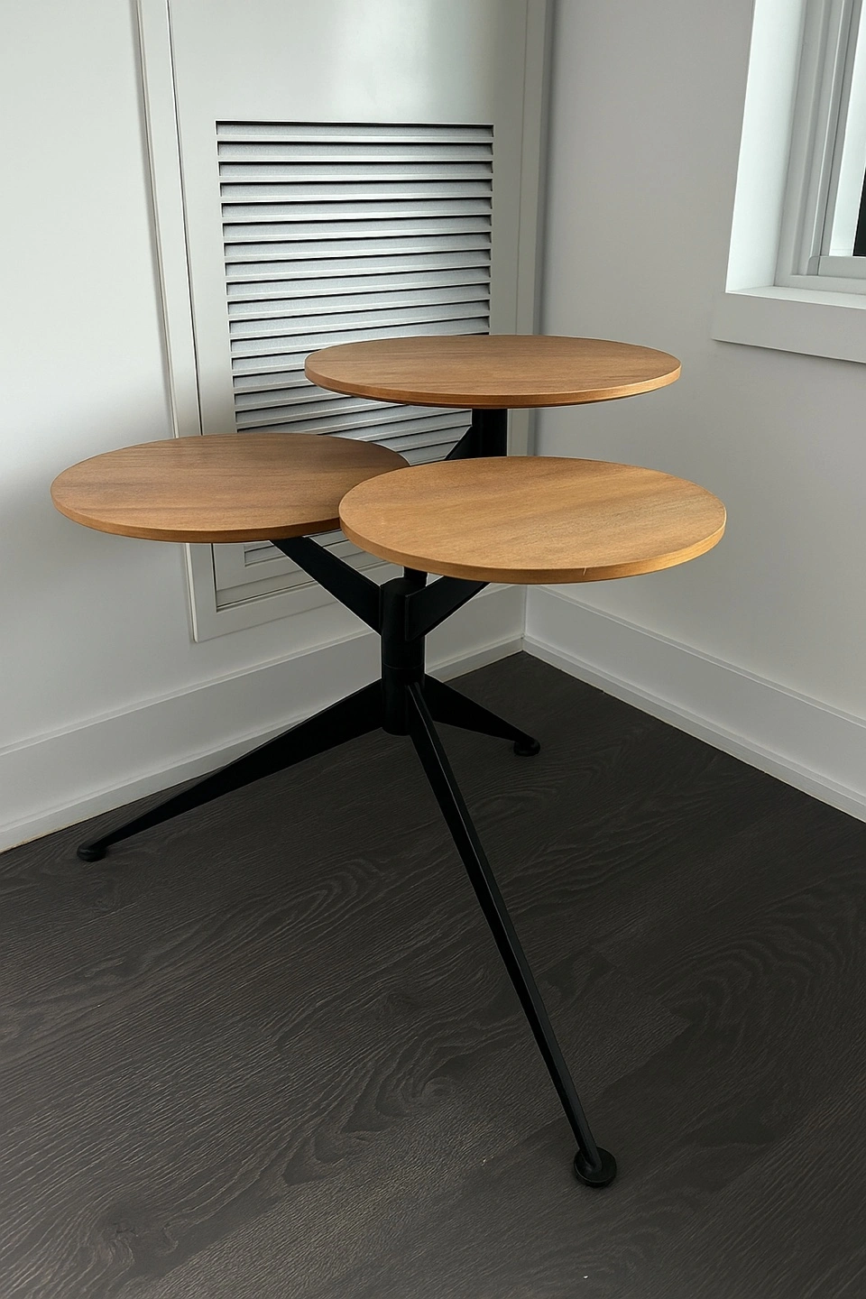 It features three round wooden tiers supported by a sleek black metal frame. It's perfect for displaying your favourite plants or decorative items and adding a touch of contemporary style to your home