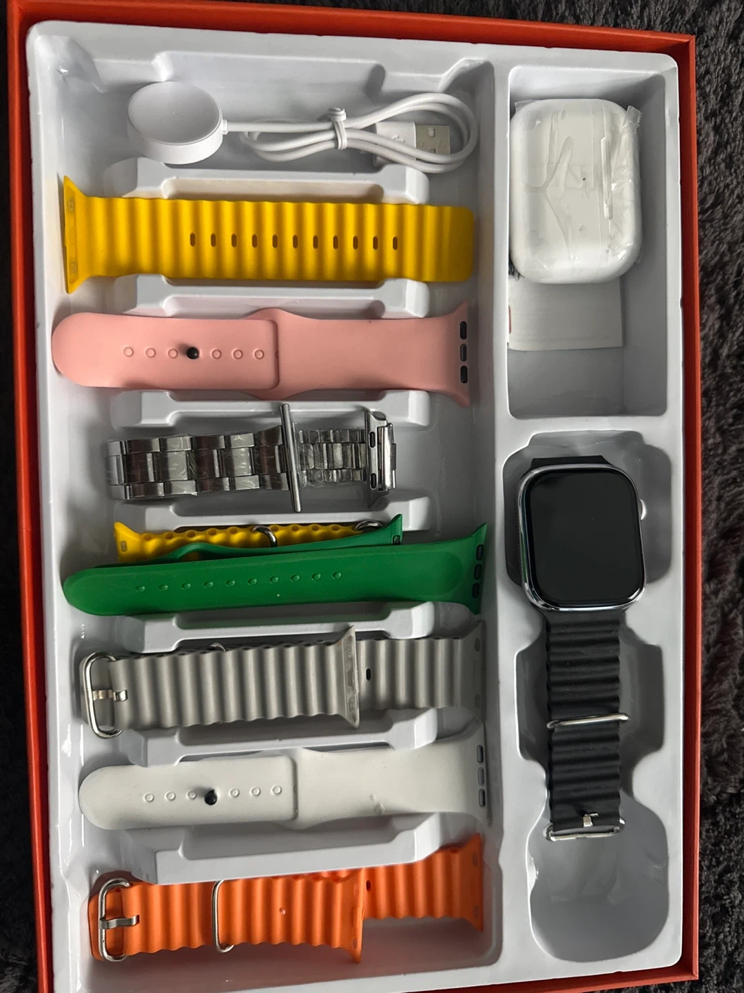 Selling a DM-02 Super AMOLED 10 Series Smartwatch! It comes with earbuds and a variety of bands to customize your look. The box includes all the original components, such as the charger and various straps. The smartwatch has features like BT call, remote capture, and message notifications.