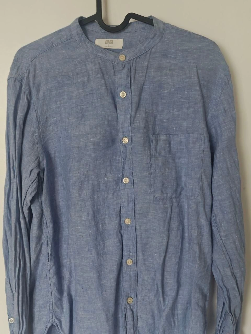 Uniqlo 100% linen collarless button-up shirt in blue. Lightweight, breathable, and comfortable — a great minimalist staple for warm weather or layering. Linen naturally wrinkles, but shirt is in good condition overall.