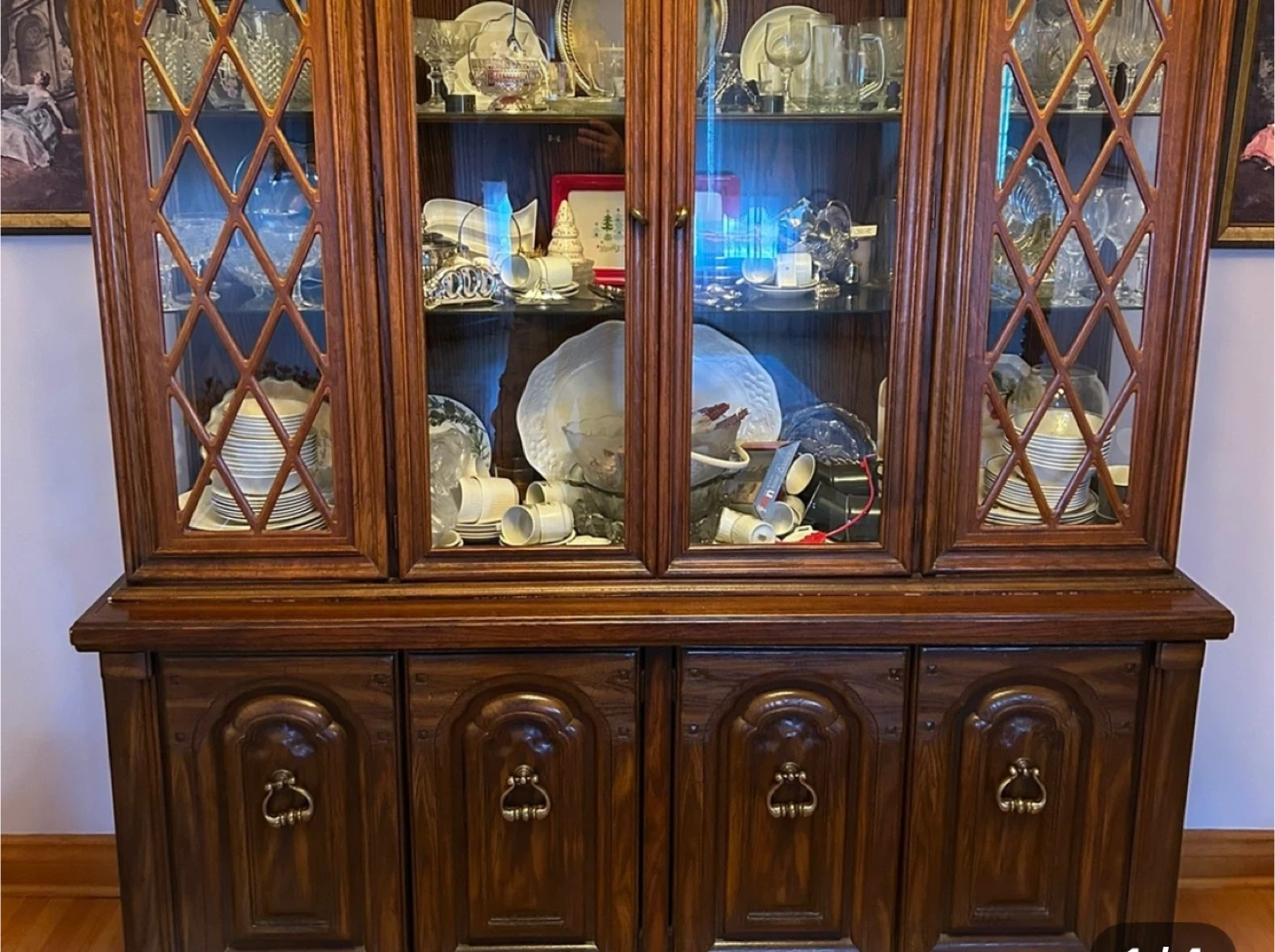 Selling a vintage wooden cabinet. It features glass doors on the upper section, perfect for displaying your favourite dishes and glassware. The bottom section has wooden doors, providing ample storage. A beautiful piece to add to your dining area!