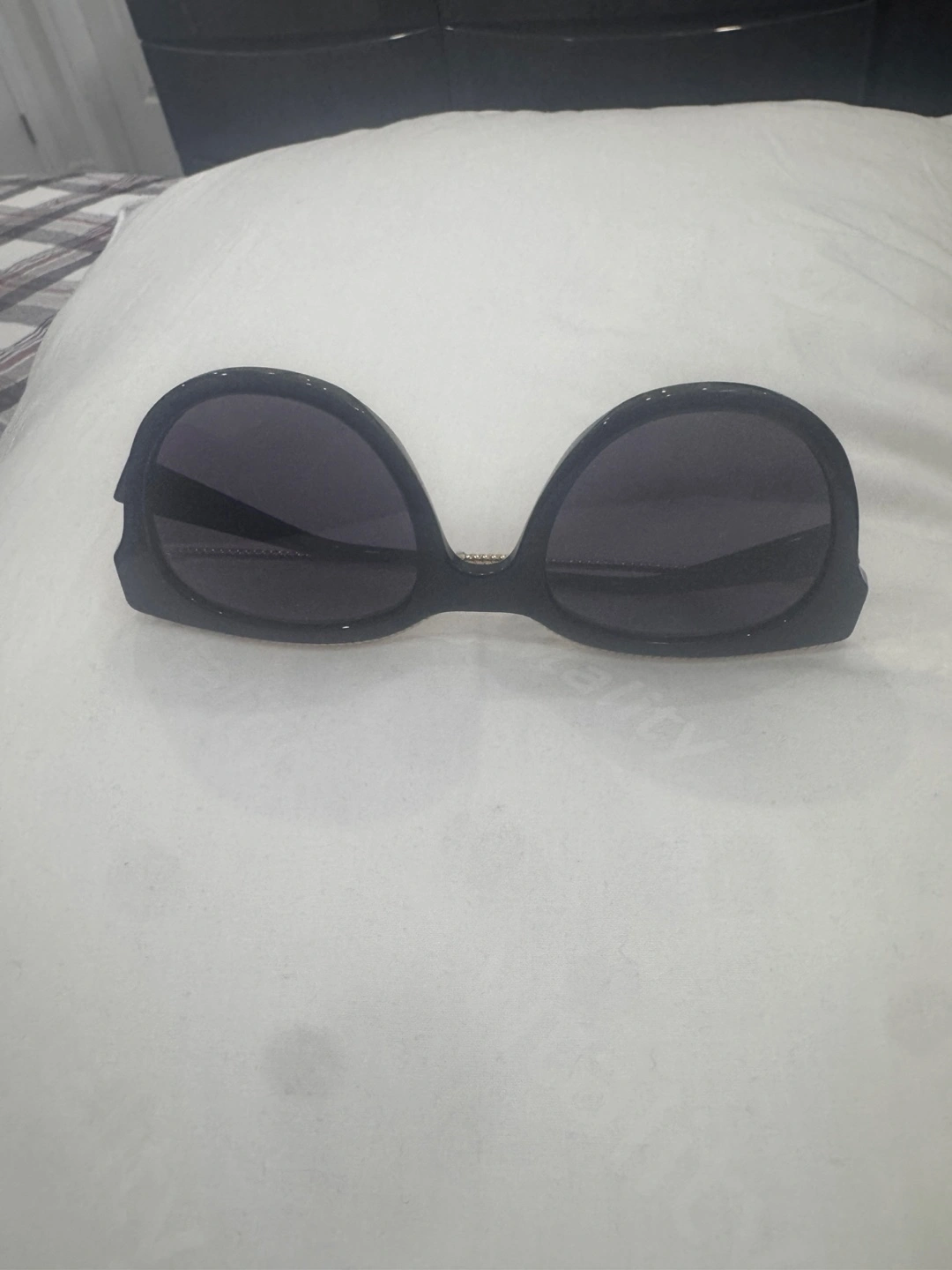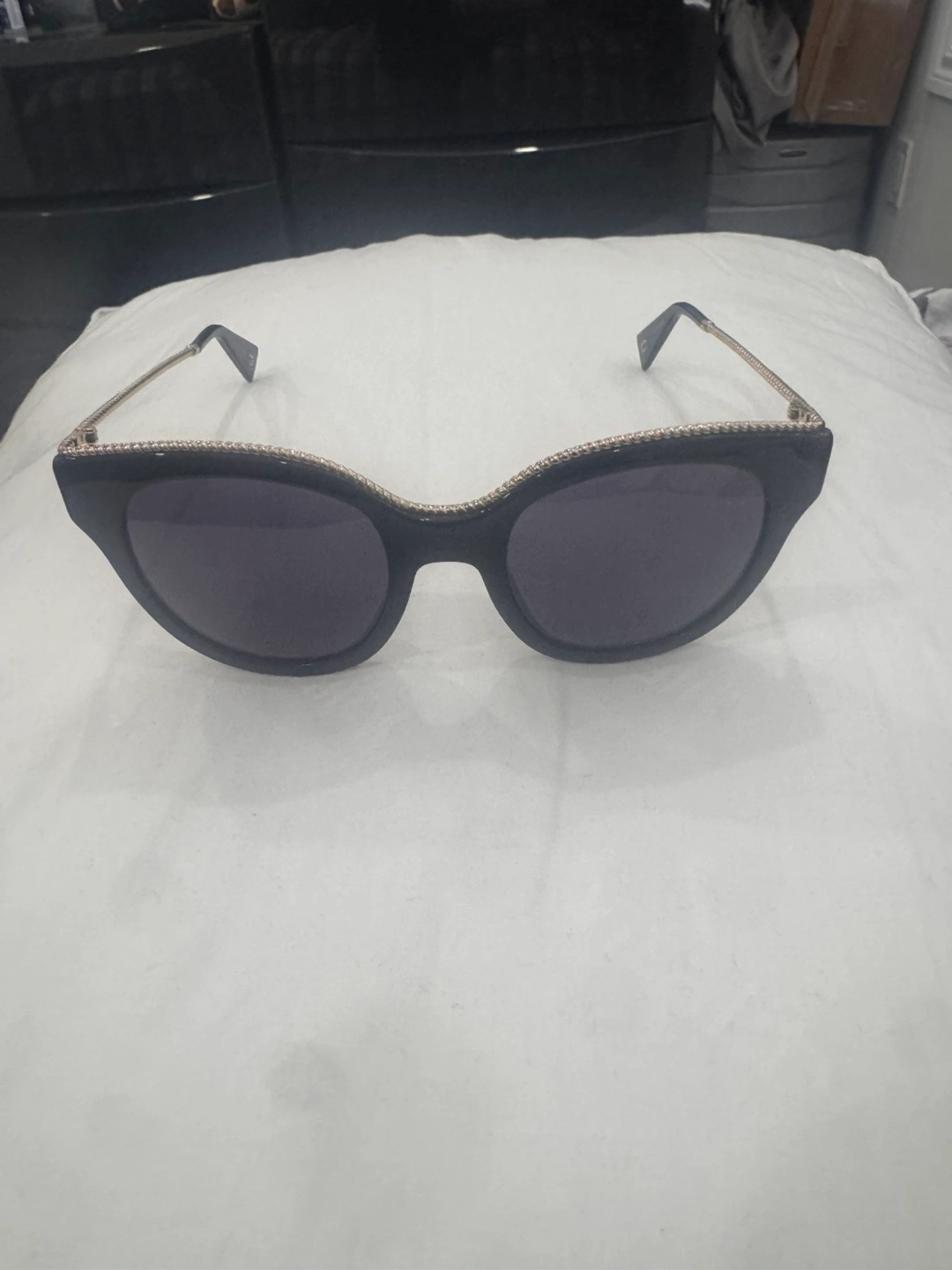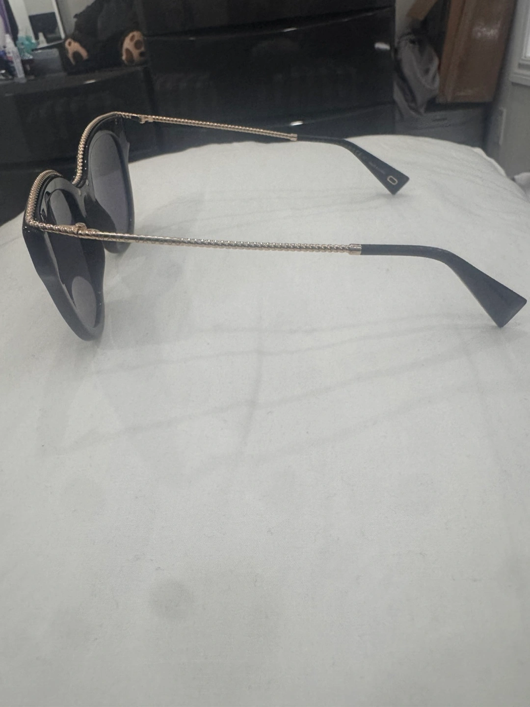 These sunglasses are in great shape and ready for a new home! They're a stylish black colour with gold accents. The brand is Marc Jacobs, so you know you're getting a quality pair of shades