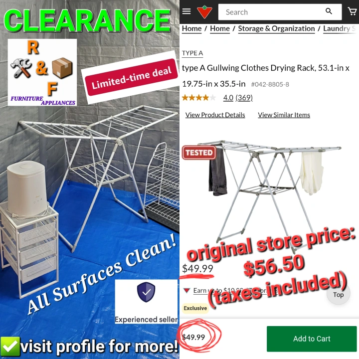 Selling a Type A Gullwing Clothes Drying Rack! It measures 53.1-in x 19.75-in x 35.5-in. Originally retailed for $56.50 (taxes included) at Canadian Tire