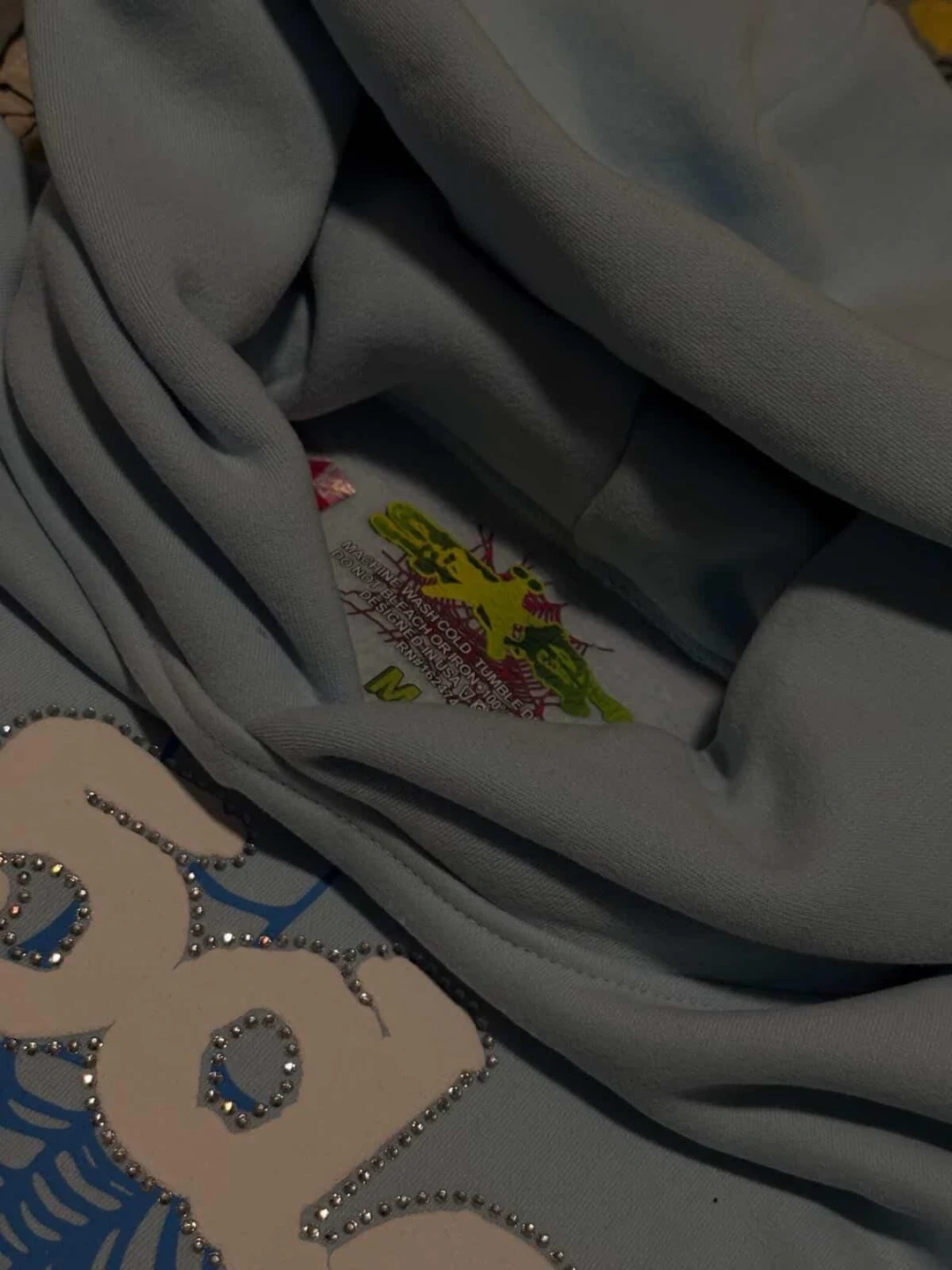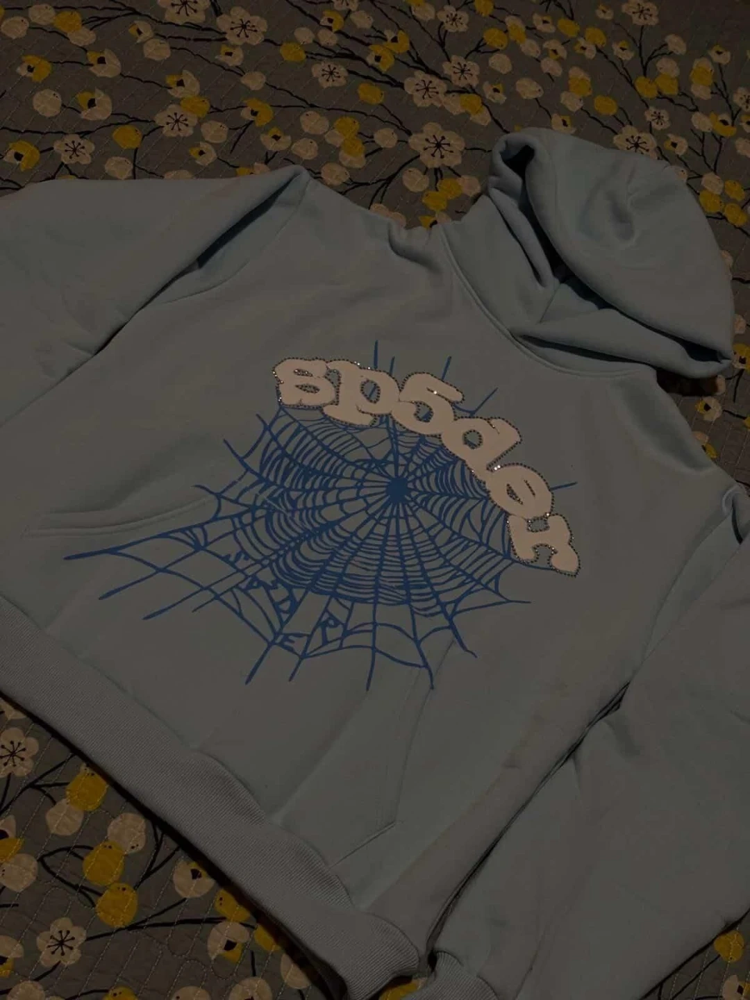 Light blue hoodie with a blue spider web graphic on the front. Features white, rhinestone-encrusted text that reads 'Sp5der'. It's a pullover style with a front pocket.