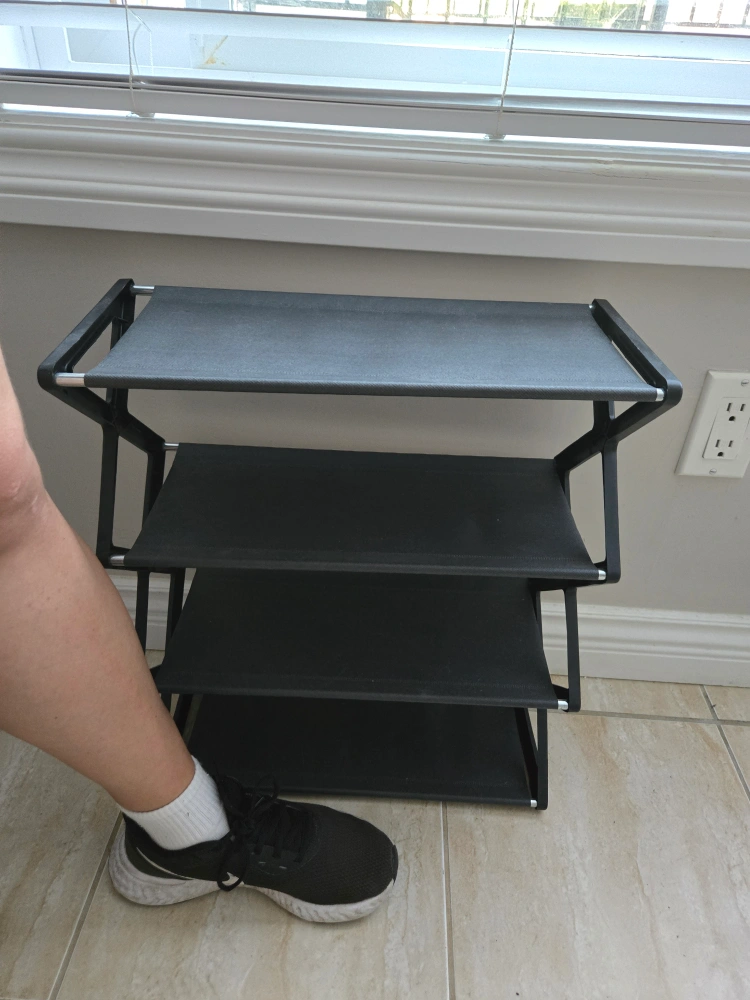 Here's a handy 4-tier shoe rack to keep your entryway tidy! It's in great condition and ready to organize your footwear. The rack is black and offers ample space for shoes of all sizes. It's lightweight and easy to move around if needed