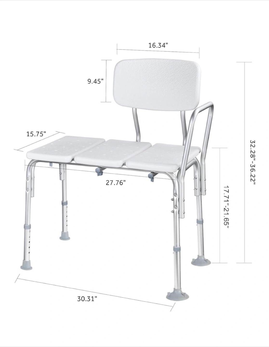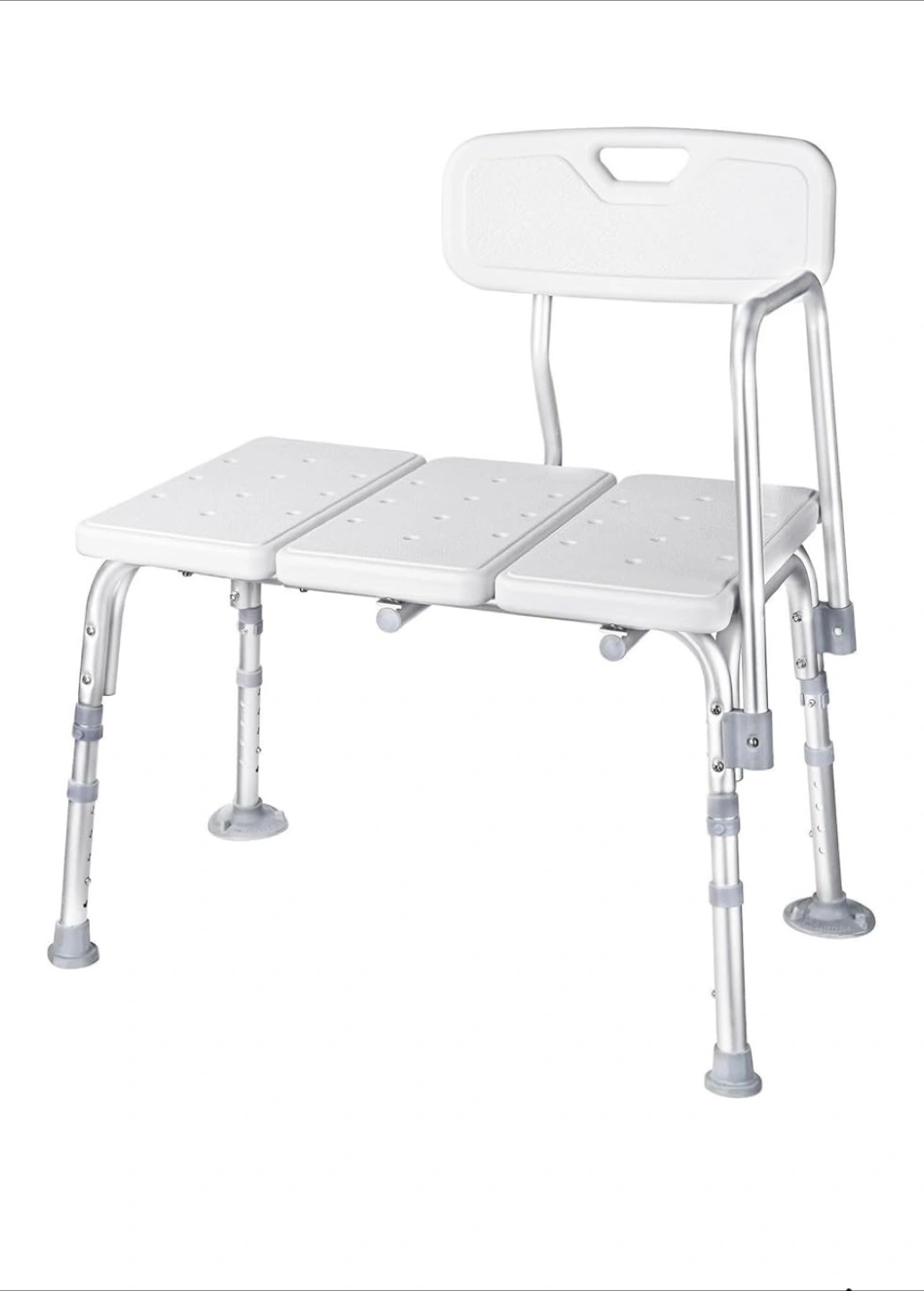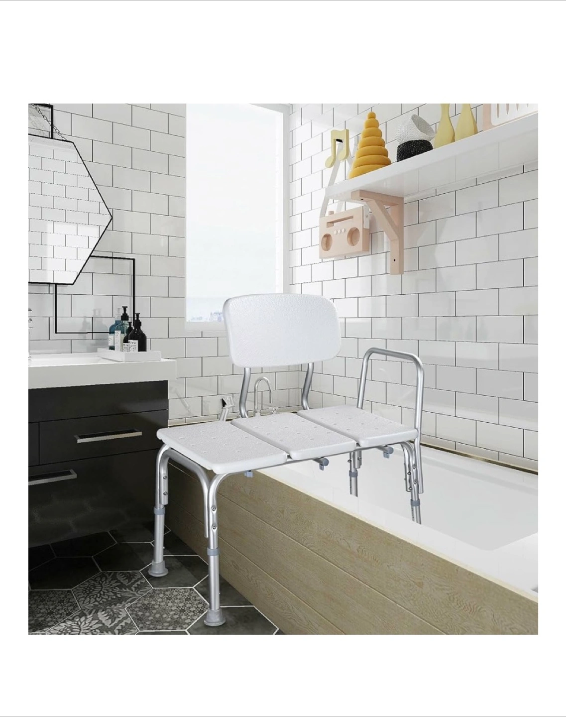 This LivingBasics bath seat offers a secure and stable experience with a static load capacity of 300lb. Features: - Removable backrest for comfortable support - Non-slip textured surface - Drainage holes to prevent pooling - Adjustable height with 5 settings Brand new, needs assembly, all parts included.