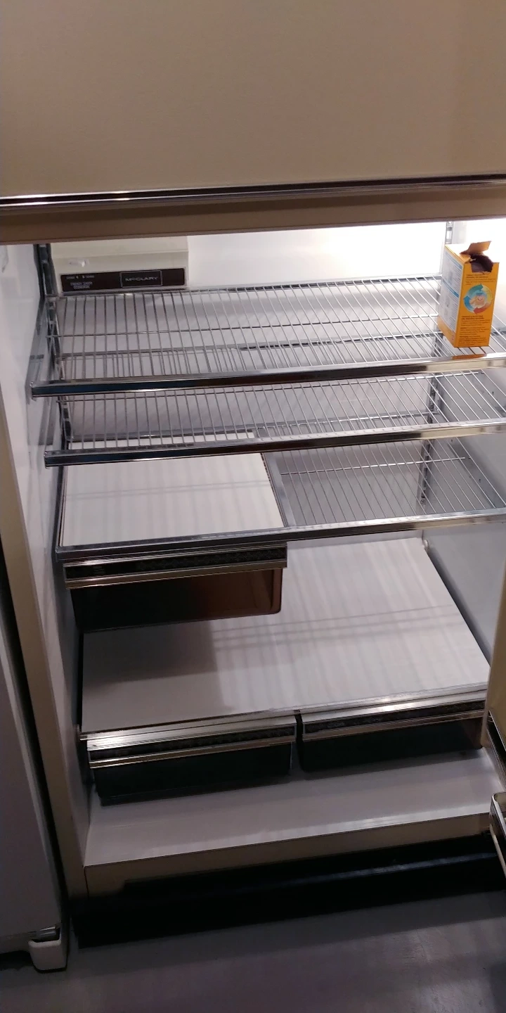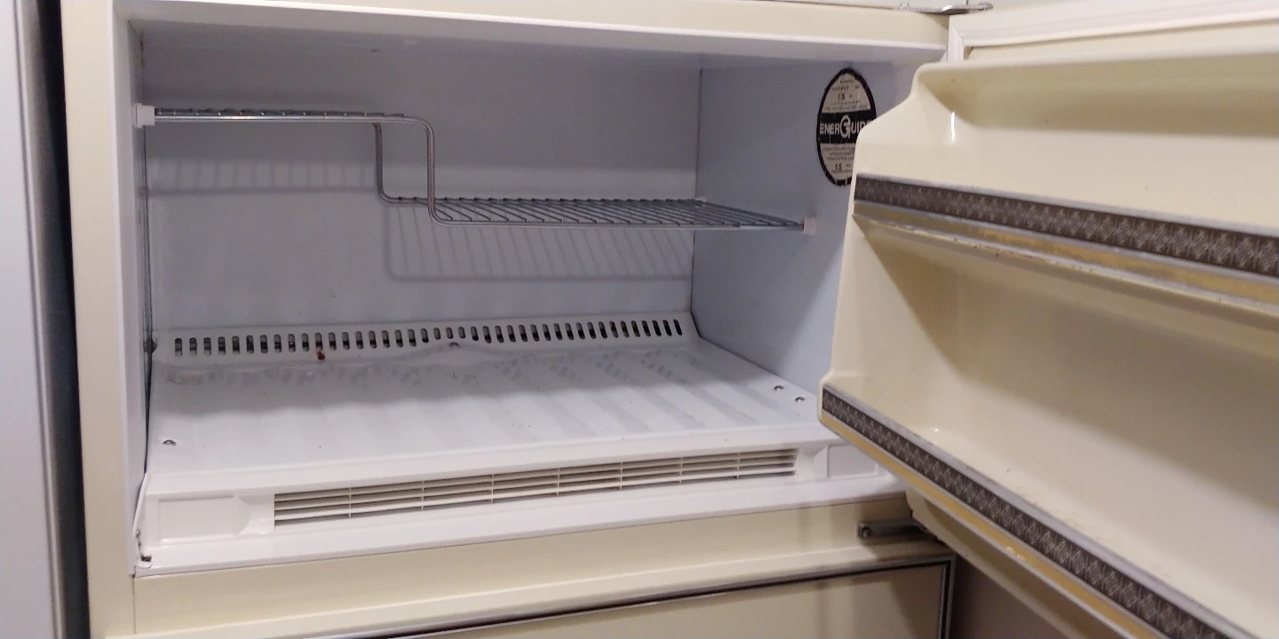 Cream-coloured, top-freezer full size refrigerator. Includes interior shelves and drawers.