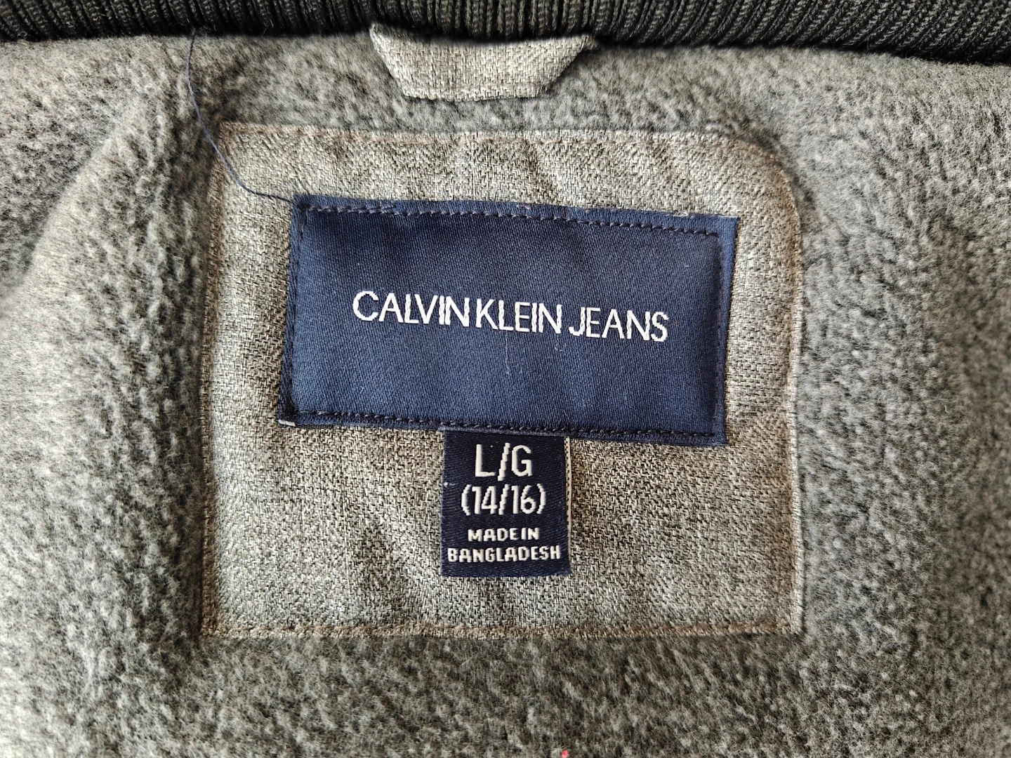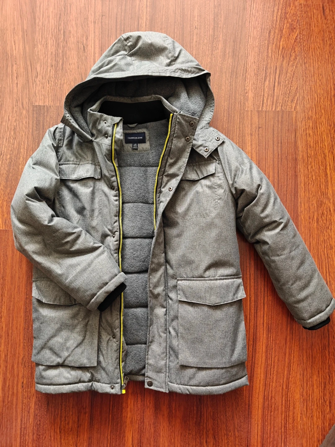 Calvin Klein Jeans boy's winter jacket in size L/G (14/16). It's made in Bangladesh and features a grey colour with a warm, quilted interior. Four front pockets provide ample storage. New. Never worn.
