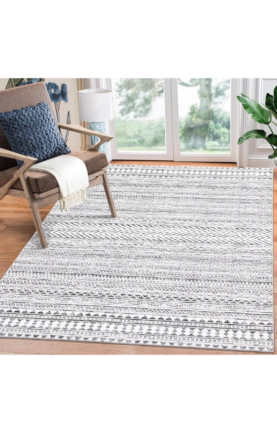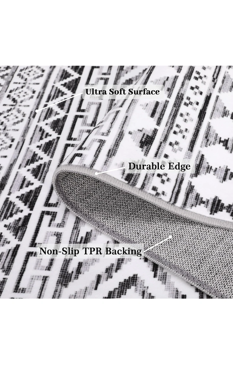 This area rug features a stylish black and white geometric pattern that would look great in any room. It has a soft surface and durable edges. The rug is easy to maintain, as it's machine washable and can be vacuumed. It also has a non-slip TPR backing for added safety
