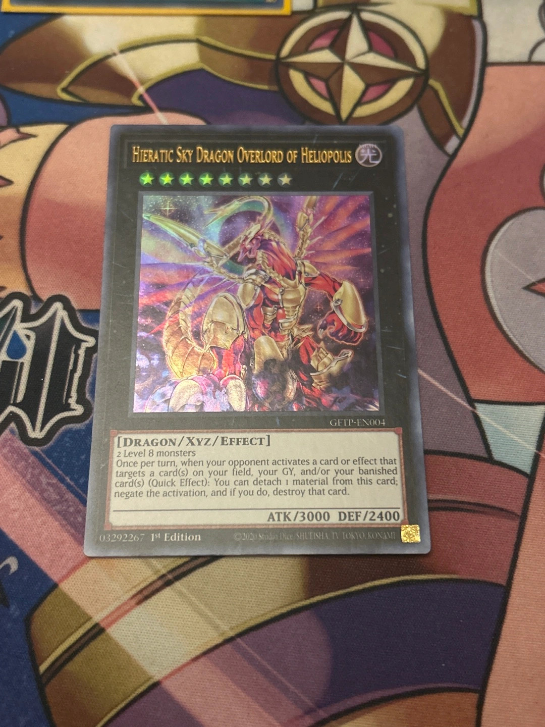 Selling a 'Hieratic Sky Dragon Overlord of Heliopolis' Yu-Gi-Oh card. It's a Dragon/XYZ/Effect monster with 3000 ATK and 2400 DEF. Once per turn, you can negate the activation of a card or effect that targets a card on your field or GY