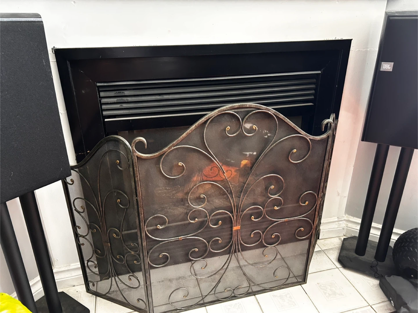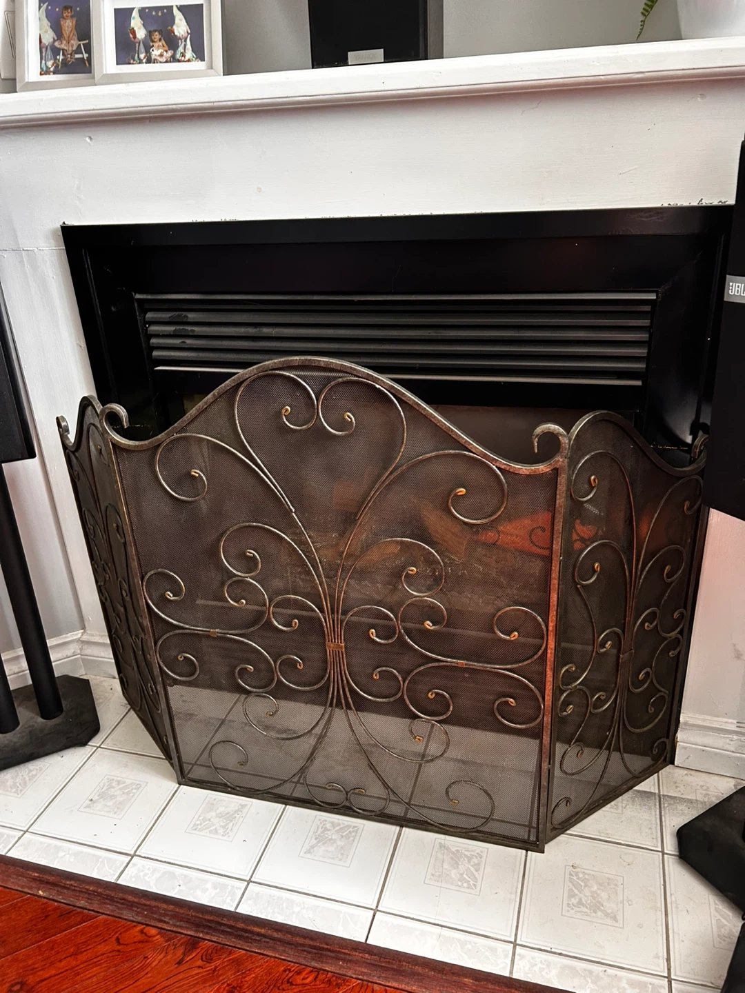 A beautiful fireplace screen that's ready to add some charm to your living space! It's perfect for keeping sparks at bay while adding a touch of elegance to your fireplace area