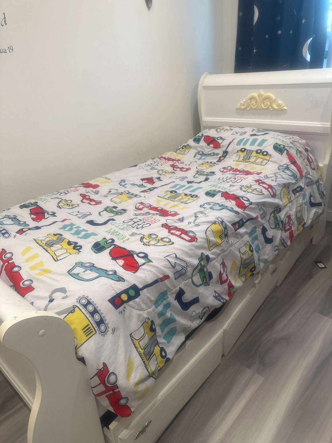 Selling a cute kids bedding set with a fun car print! It's perfect for a toddler bed or a small single bed. The colours are bright and cheerful, and it's in great condition. Add some fun to your little one's room! With matress