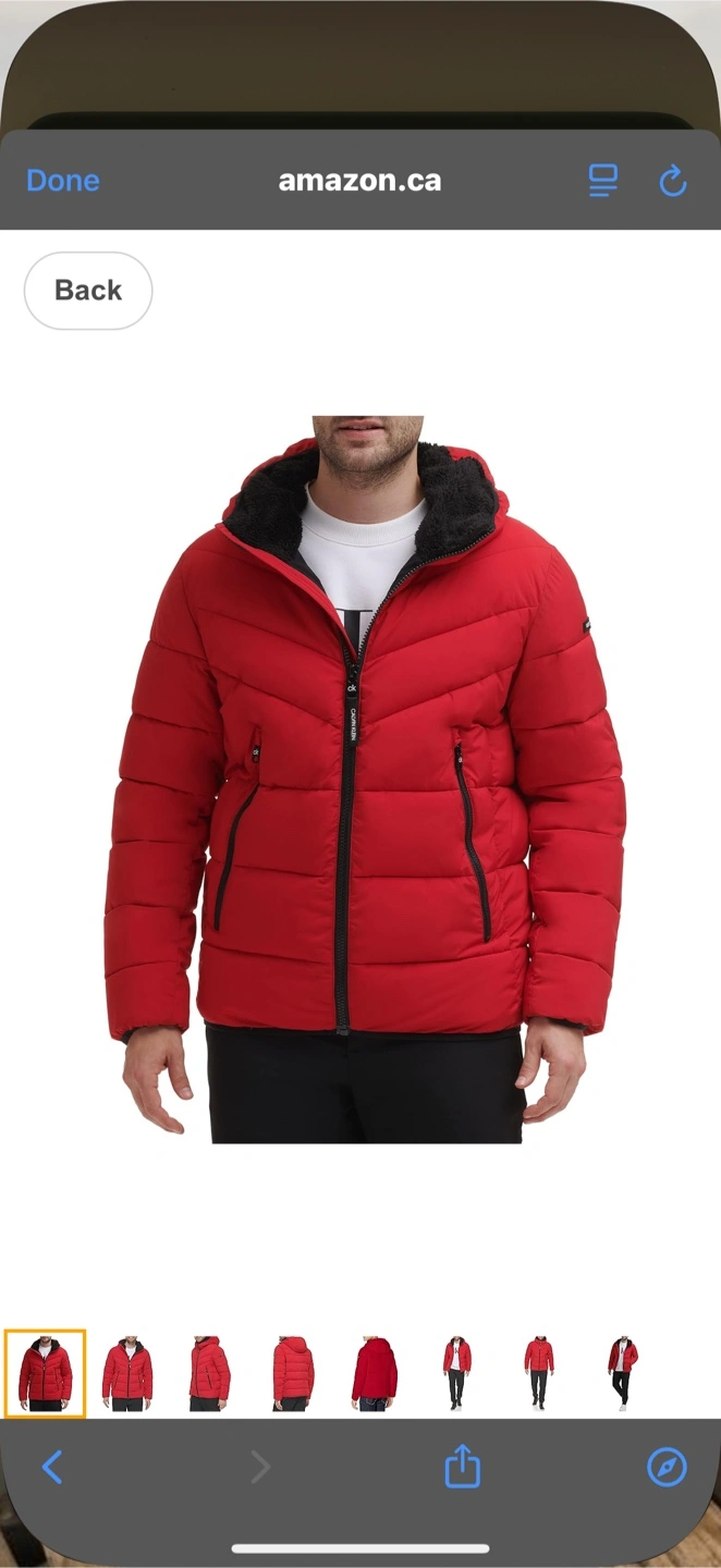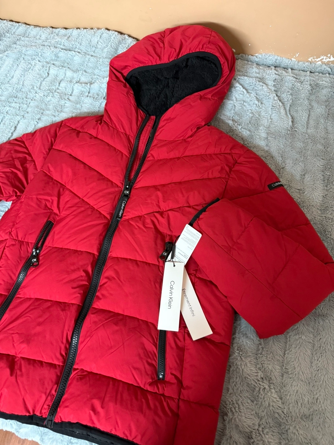 Selling a Calvin Klein red puffer jacket in size medium. It's in great condition and ready to keep you warm this winter! The jacket features a hood with a black faux fur lining and a stylish, quilted design. Perfect for those chilly Canadian days!
