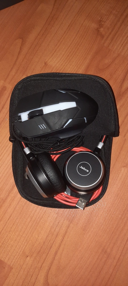Selling a Jabra headset and a black mouse. They both come in a carrying case, making them easy to transport. Perfect for work or gaming!