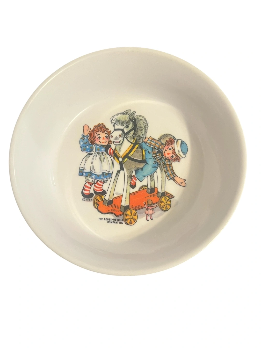 • Vintage 1969 melamine cereal bowl by Oneida Deluxe (marked 3243) • Features Raggedy Ann, Raggedy Andy, and horse illustration — licensed by The Bobbs-Merrill Company Inc. • Material: Melamine (durable hard plastic widely used in the 1960s–70s) • Size: 6 ¼ inches across x 1 ¾ inches tall • Condition: Very good vintage condition, colorful graphic remains intact 💲 Asking Price: $30 – firm 📍 Pickup at Islington & Finch or Jane & Eglinton area. Delivery available within a reasonable distance.