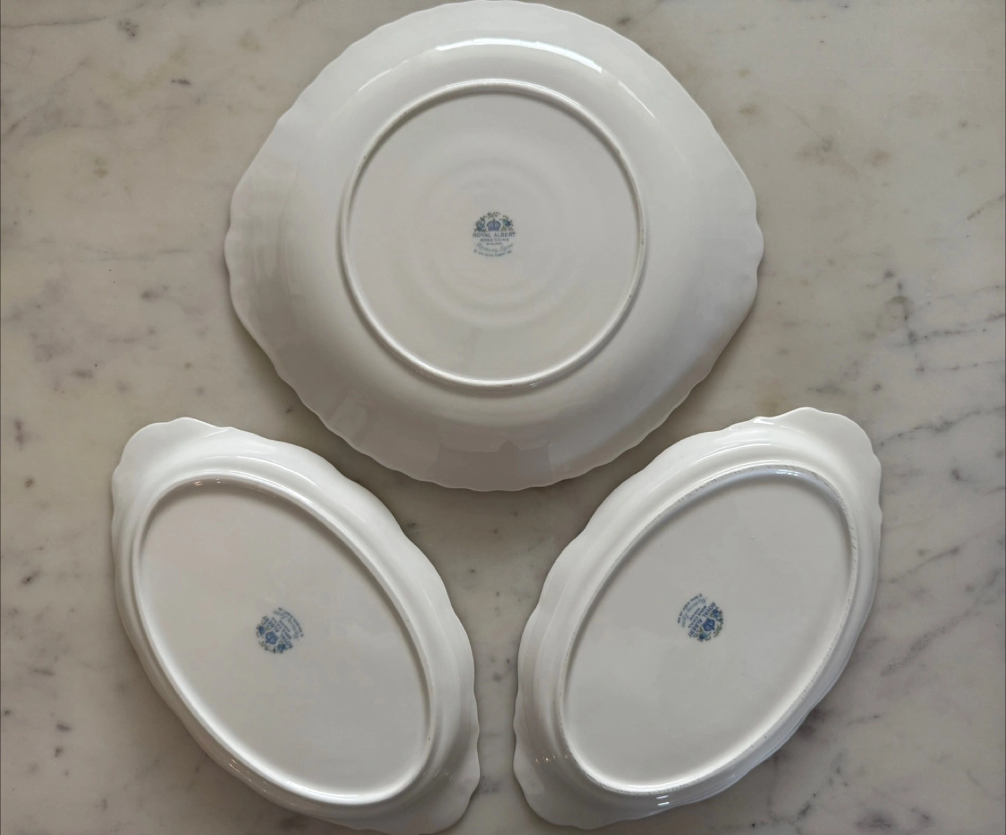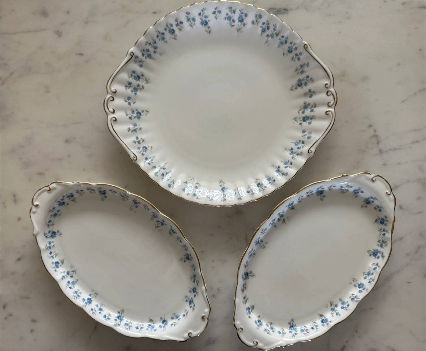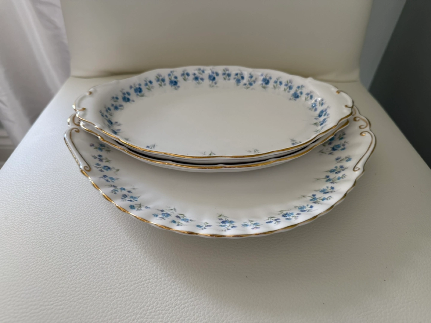 135‼️ d o w n s i z i n g ‼️ 📍 pick up near Greenbank / Hunt Club 💸 priced to sell quickly Royal Albert Memory Lane bone china. No chips, cracks or scratches. This set includes a round cake plate and two oval serving dishes with a delicate blue floral pattern and gold trim. Thank you for your interest! Merci de votre intérêt !