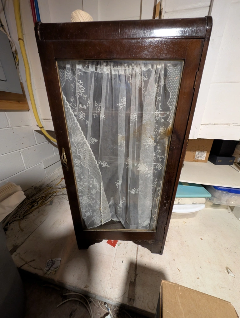 Here's a lovely vintage wooden cabinet, perfect for adding a touch of rustic charm to your home! It features a dark brown finish and a classic design. It has shelves inside. It would be great for displaying your favourite items or storing your belongings. Don't miss out on this unique piece!