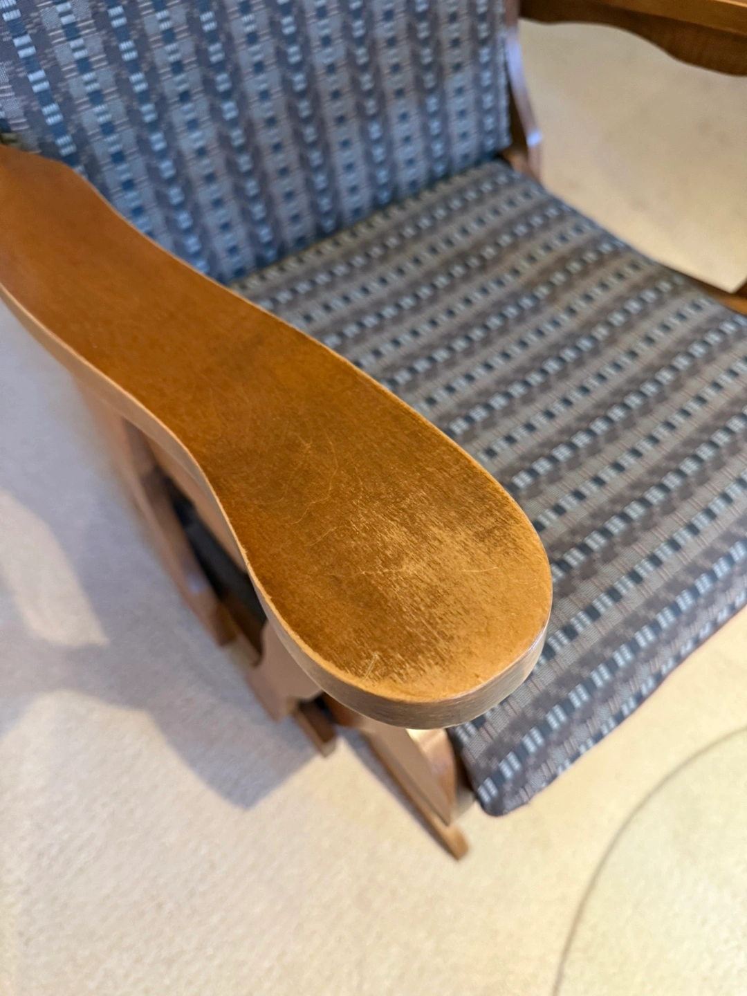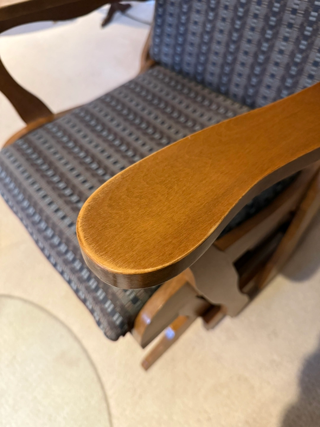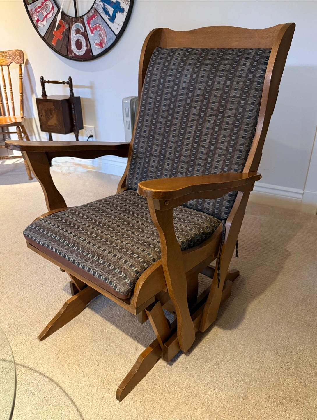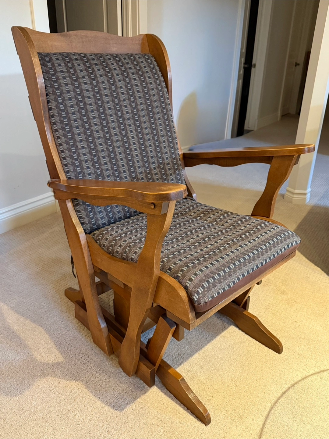 135‼️ d o w n s i z i n g ‼️ 📍 pick up near Greenbank / Hunt Club 💸 priced to sell quickly Glider rocking chair with a wooden frame and patterned fabric cushions. It belonged to my paternal grandmother. So many wonderful memories! Time for someone else to enjoy it and create new memories 🤍 Glides very smoothly, no noise. Perfect for nursery or reading nook. The wood has wear on the armrests from use which adds character to this vintage piece! 🚫 clean, smoke-free home / no pet hair Thank you for your interest! Merci de votre intérêt !