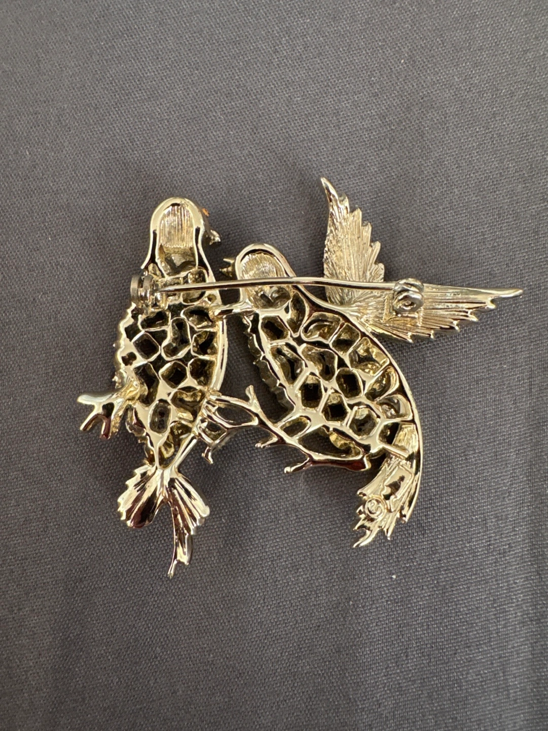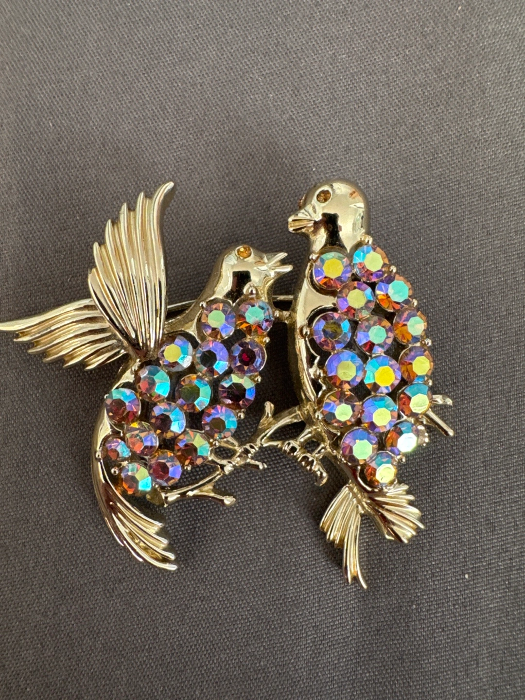 610This is a beautiful vintage brooch featuring two birds adorned with colourful rhinestones. It's a unique piece that would add a touch of sparkle to any outfit. The brooch is in good condition and ready to be loved!