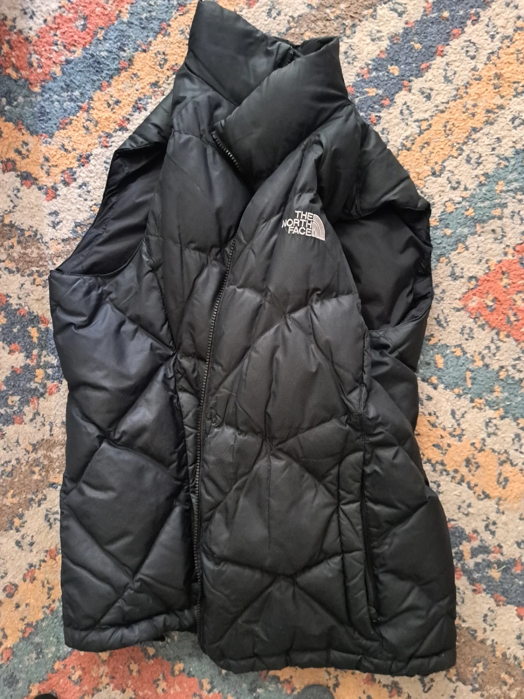 This is a black down-filled vest from The North Face. It features a full-zip front and zippered hand pockets. It's a great layering piece for cooler weather.