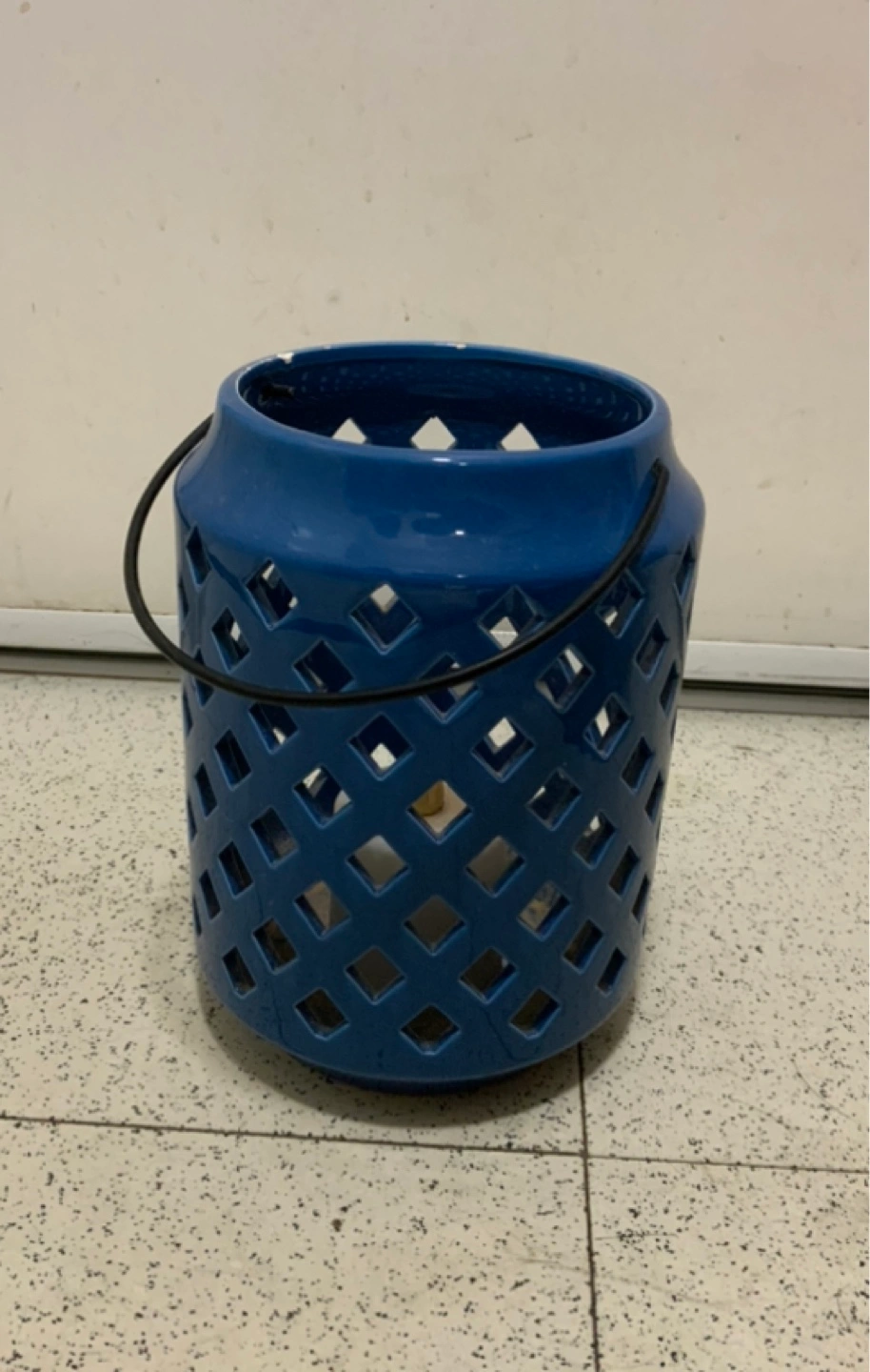 This is a lovely blue decorative lantern. It features a unique diamond-shaped cutout design and a convenient handle for easy carrying or hanging. Currently has an LED candle but can be used with a real candle as well