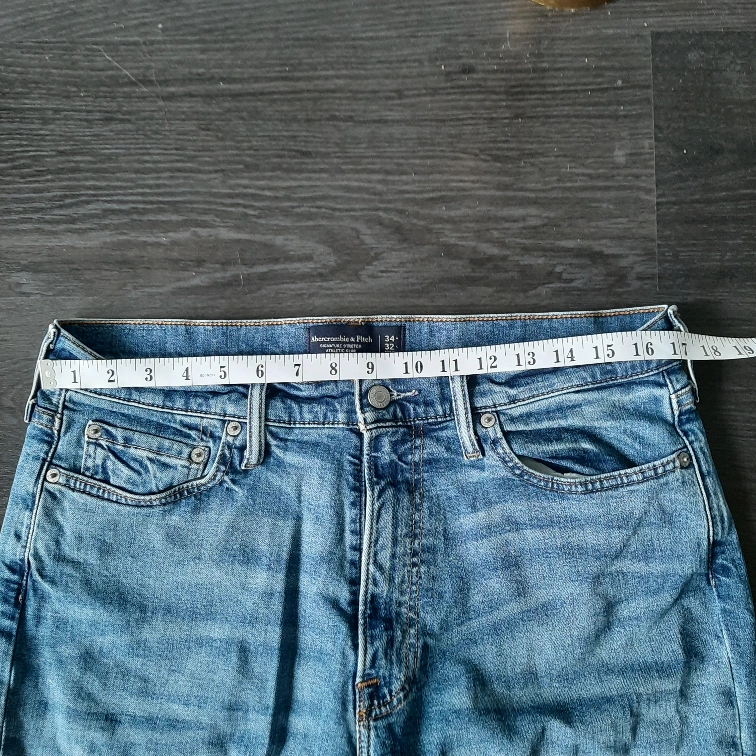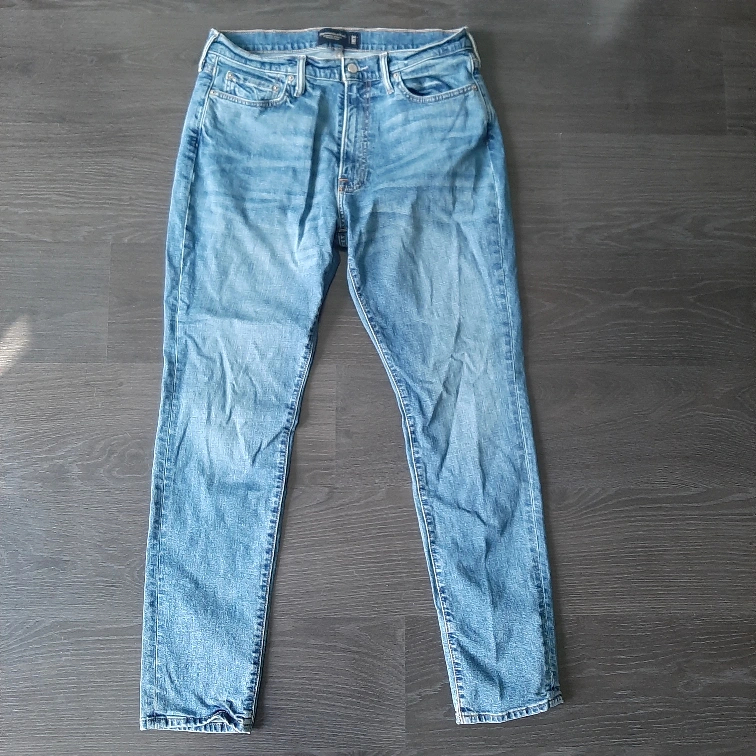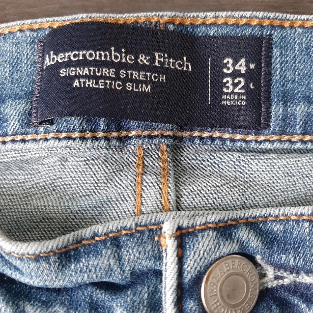Selling a pair of Abercrombie & Fitch Signature Stretch Athletic Slim jeans. They're a size 34 waist and 32 length. The material is 94% cotton, 4% polyester and 2% elastane