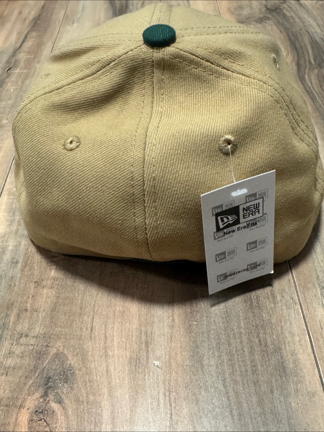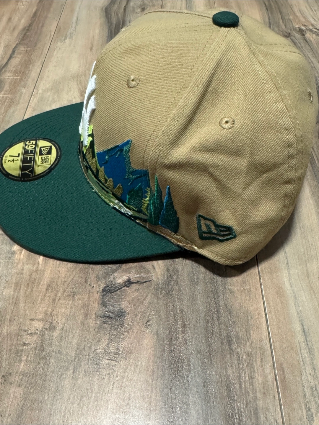 Selling a New Era 59FIFTY Cooperstown Collection New York Yankees hat. It's a size 7 1/2. The hat is a tan colour with a green brim and has a New York Yankees logo on the front. It also has a mountain scene embroidered around the base of the crown.