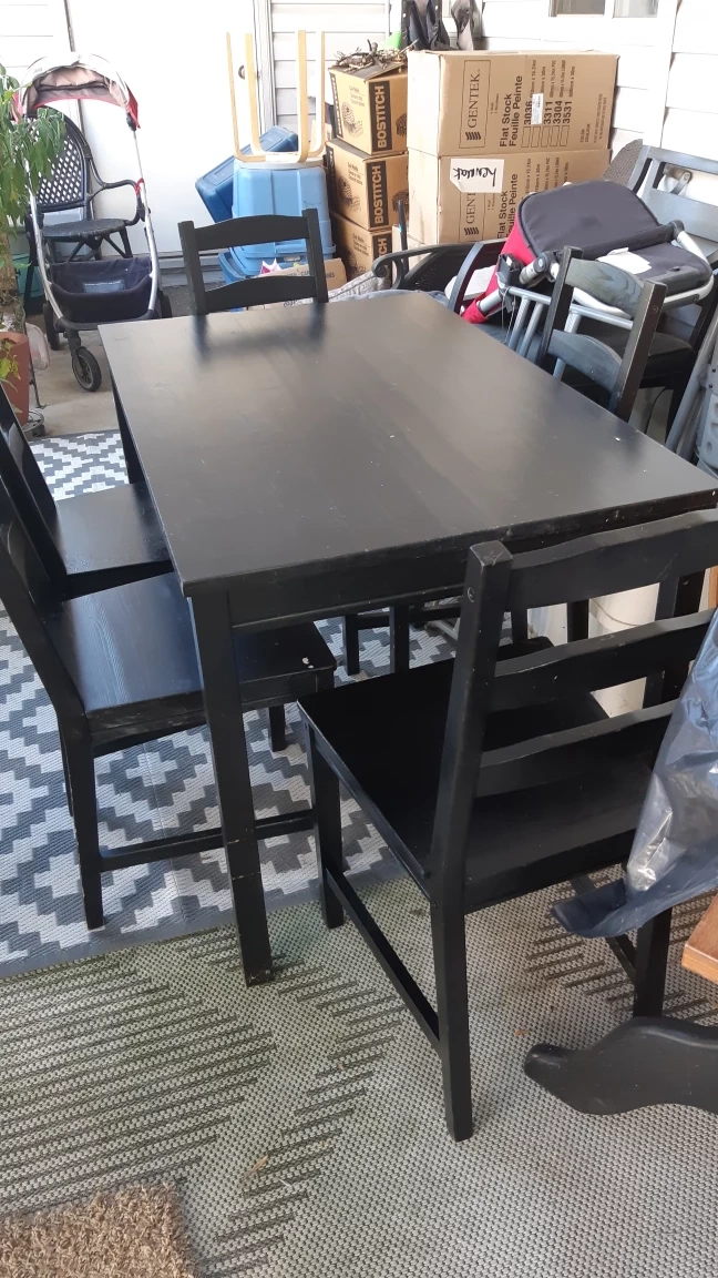 Selling a black dining table with five matching chairs. It's a great set for a small dining area or kitchen. The table and chairs are in good condition and ready for a new home. ( could use a little paint touchups) Perfect for family meals or entertaining friends! pickup location near Southgate mall