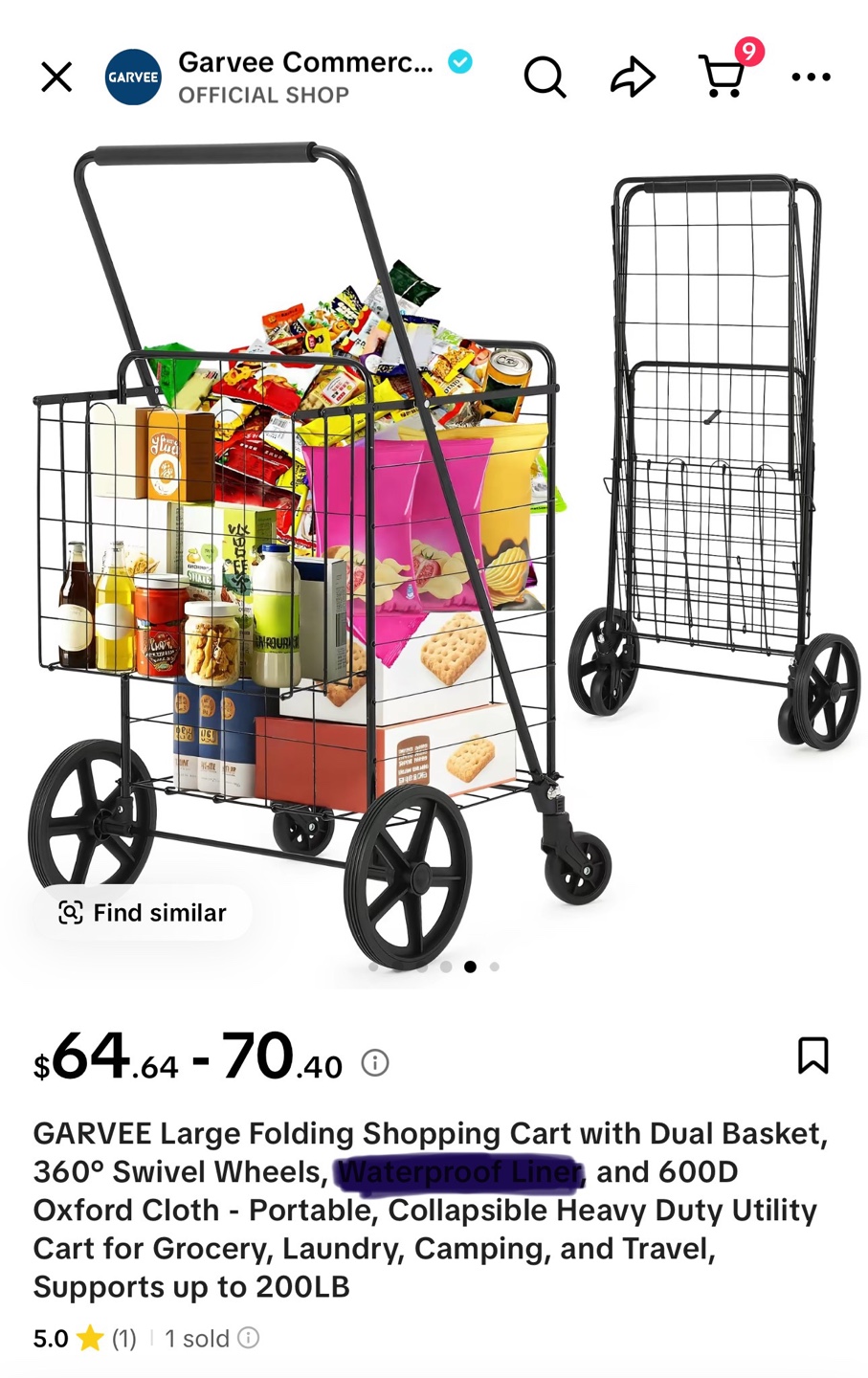This GARVEE large folding shopping cart is perfect for groceries, laundry, camping, and travel! It features dual baskets, 360° swivel wheels, a safety proof liner, and 600D Oxford Cloth. It's a portable, heavy-duty utility cart that supports up to 200 lbs. Originally priced between $64.64 and $70.40