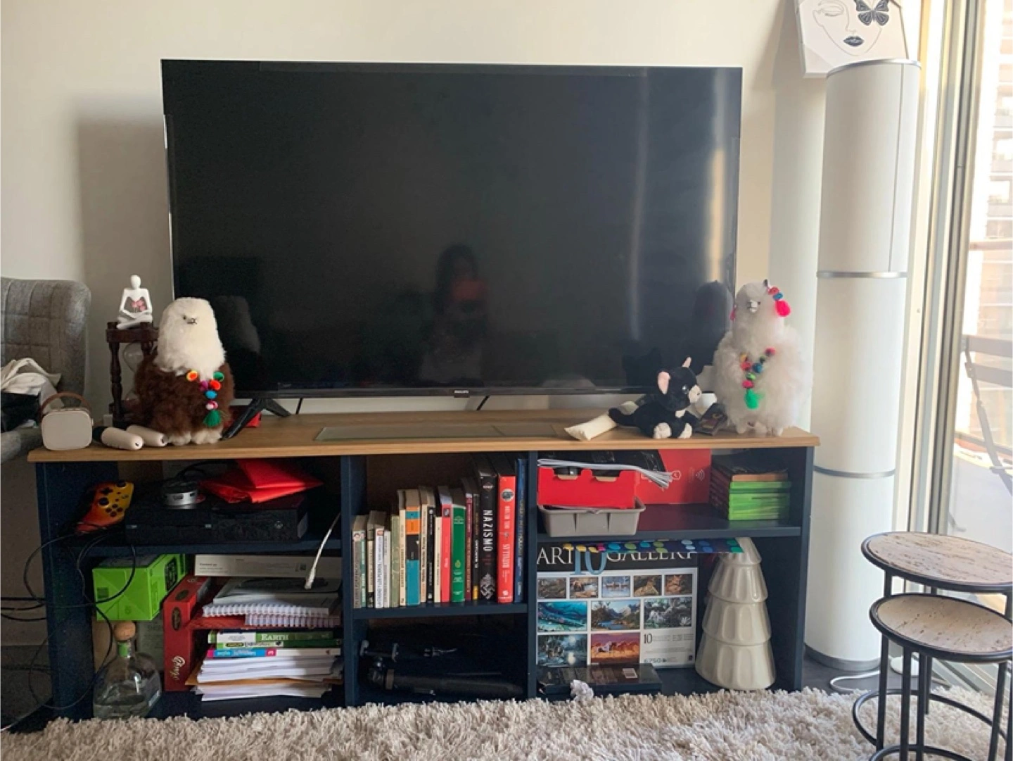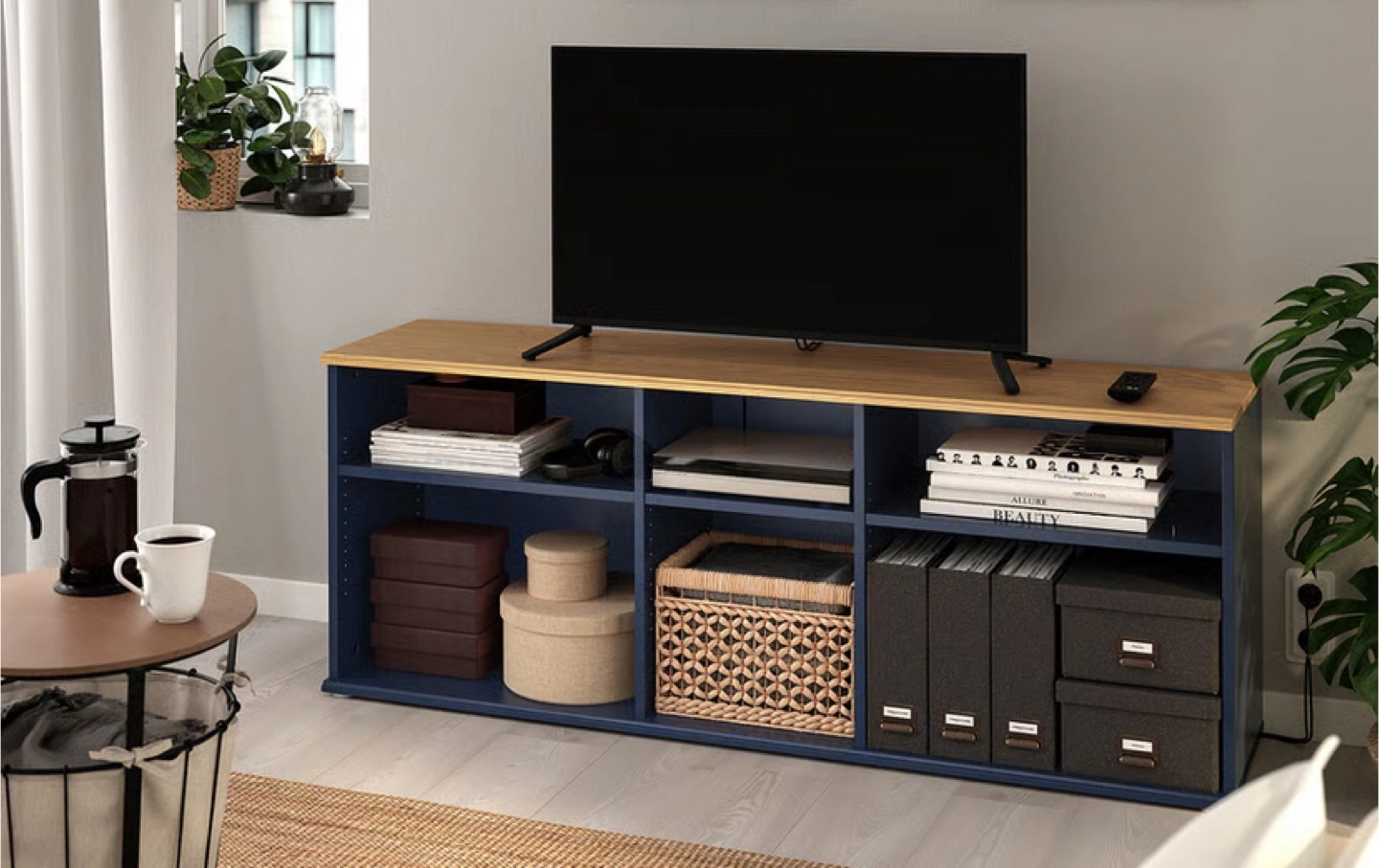 Selling an IKEA Kallax shelf unit in great condition! This versatile unit is perfect for organizing books, decor, or media components. The combination of blue and wood tones adds a modern touch to any room. It's sturdy and has plenty of storage space!