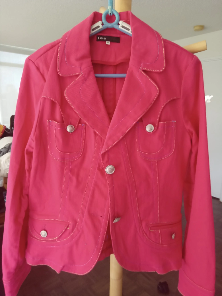 277Selling a stylish Esian blazer in a vibrant pink colour! It's a size 77 and features a unique design with decorative stitching and silver buttons. Perfect for adding a pop of colour to your wardrobe