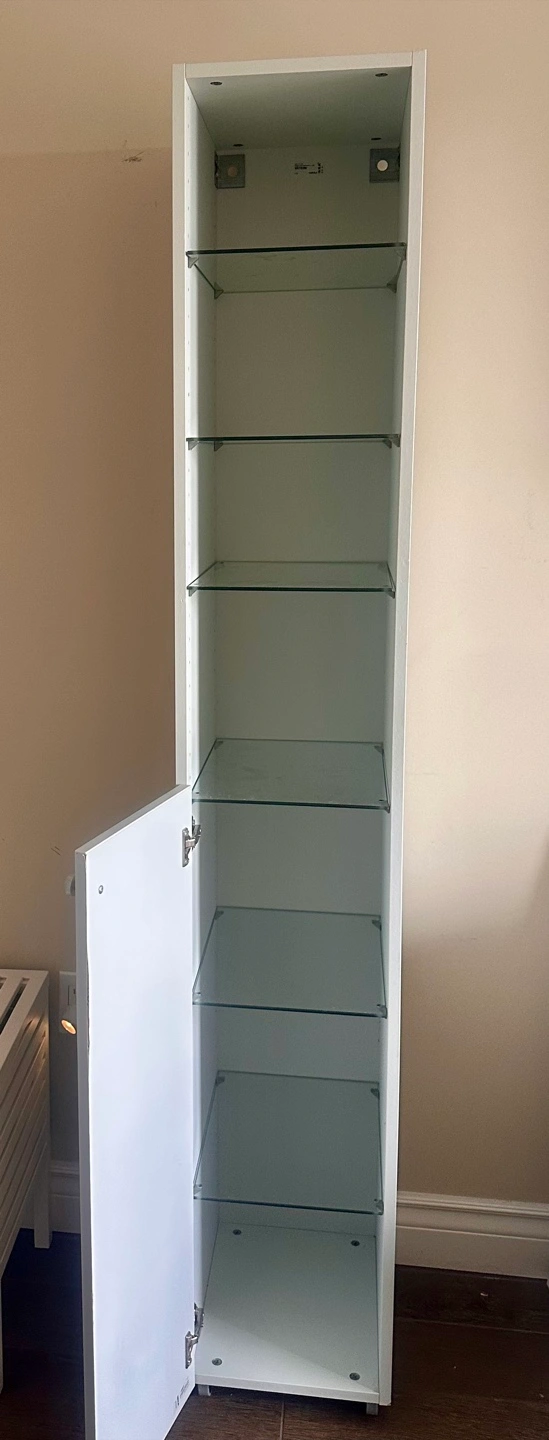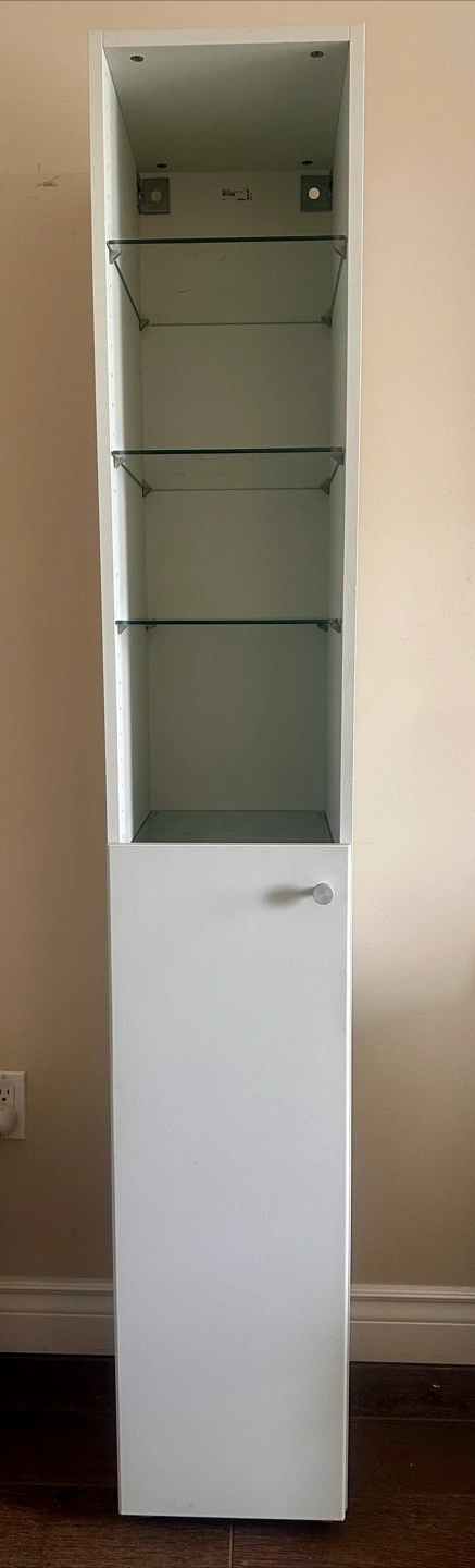Downsizing!! Selling a tall Ikea cabinet in white! It comes with adjustable glass shelves, perfect for displaying your favourite items or storing bathroom essentials. It's in great condition and ready for a new home! The cabinet provides ample storage space while maintaining a sleek and minimalist look for any room