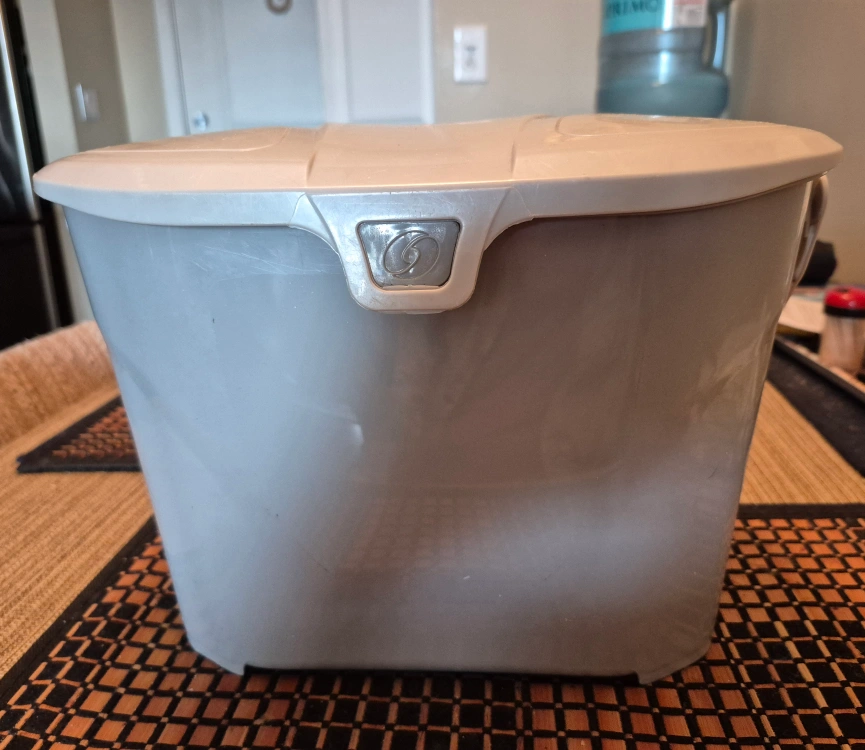 A kitchen compost bin in great condition! It's a handy size for collecting food scraps and keeping your kitchen tidy. The bin is a neutral grey colour, so it fits in with any decor.