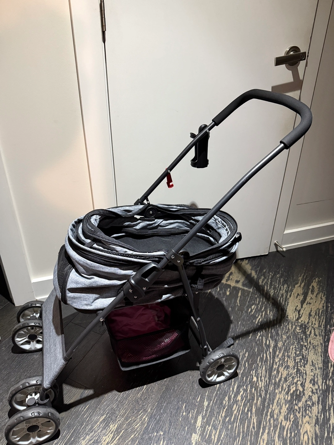 51Looking to sell my pet stroller. It's in great condition and perfect for taking your furry friend on walks around the neighbourhood. The carrier is detachable and can be used on its own. The stroller is grey and black and has a storage basket underneath and cup holder.