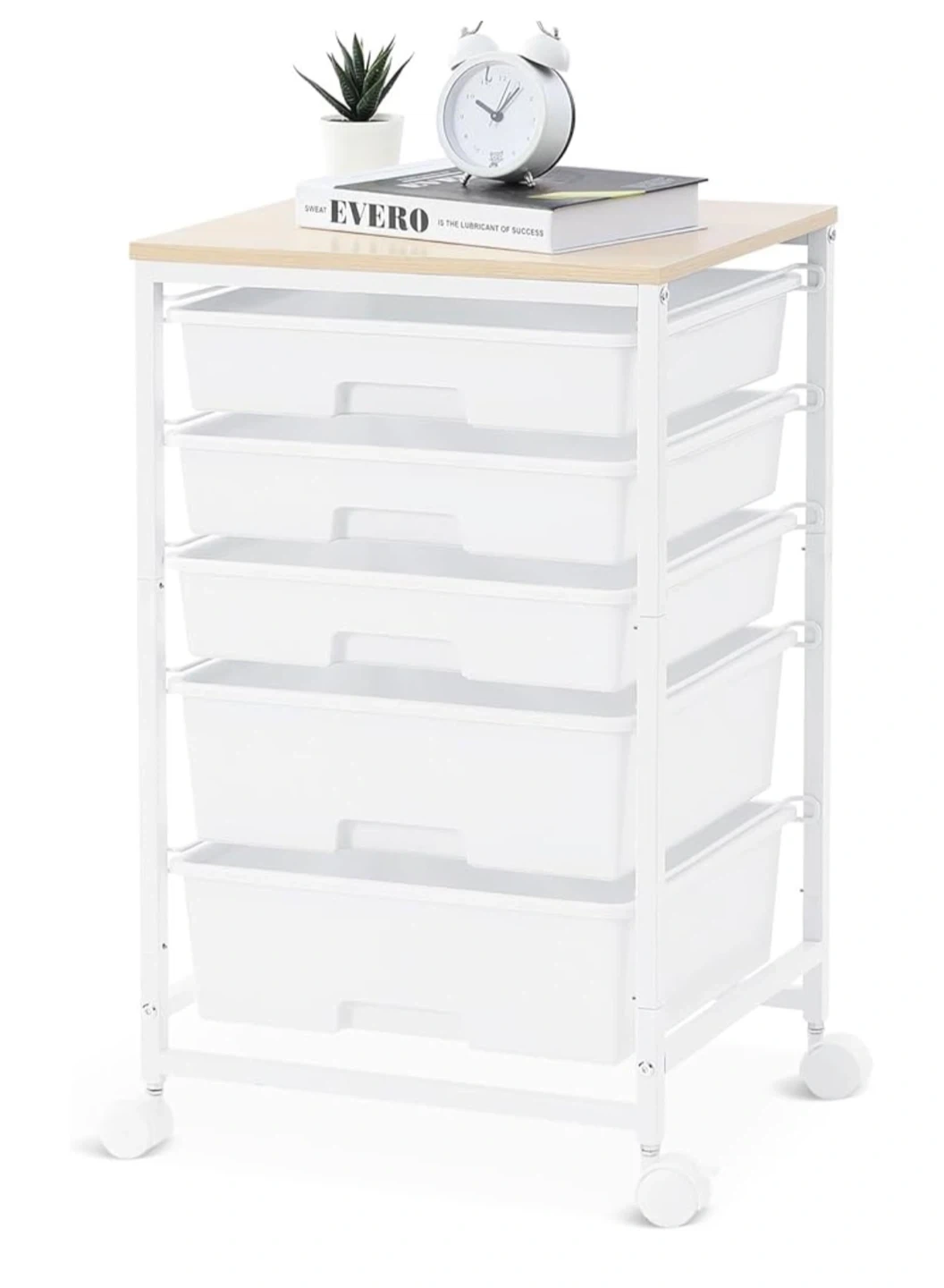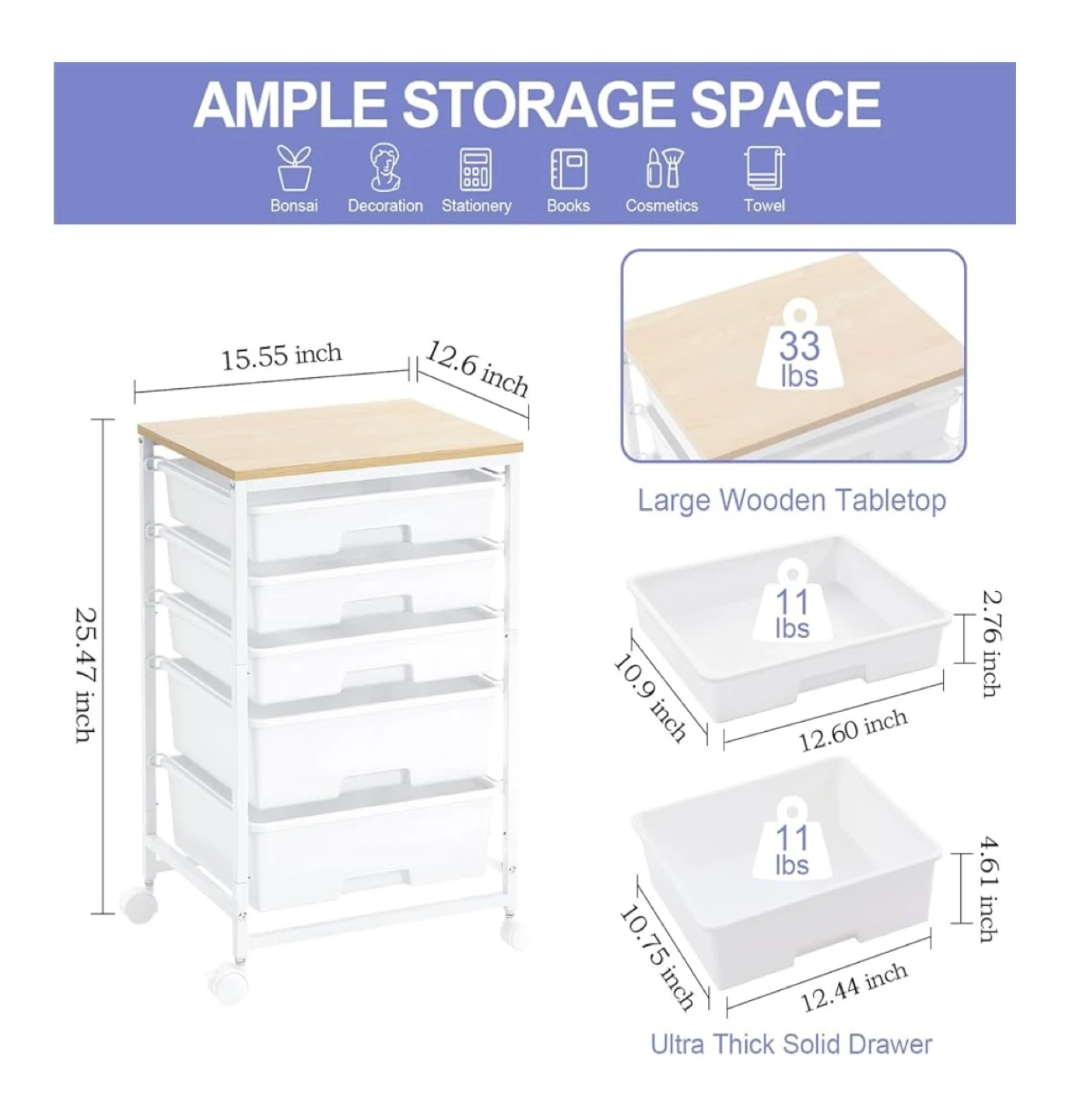 Declutter your space with this handy rolling storage cart! It features five drawers for ample storage and a large wooden tabletop. The cart is designed with a sturdy frame and smooth track drawers, making it both durable and easy to use. You can use it with or without the wheels, depending on your needs