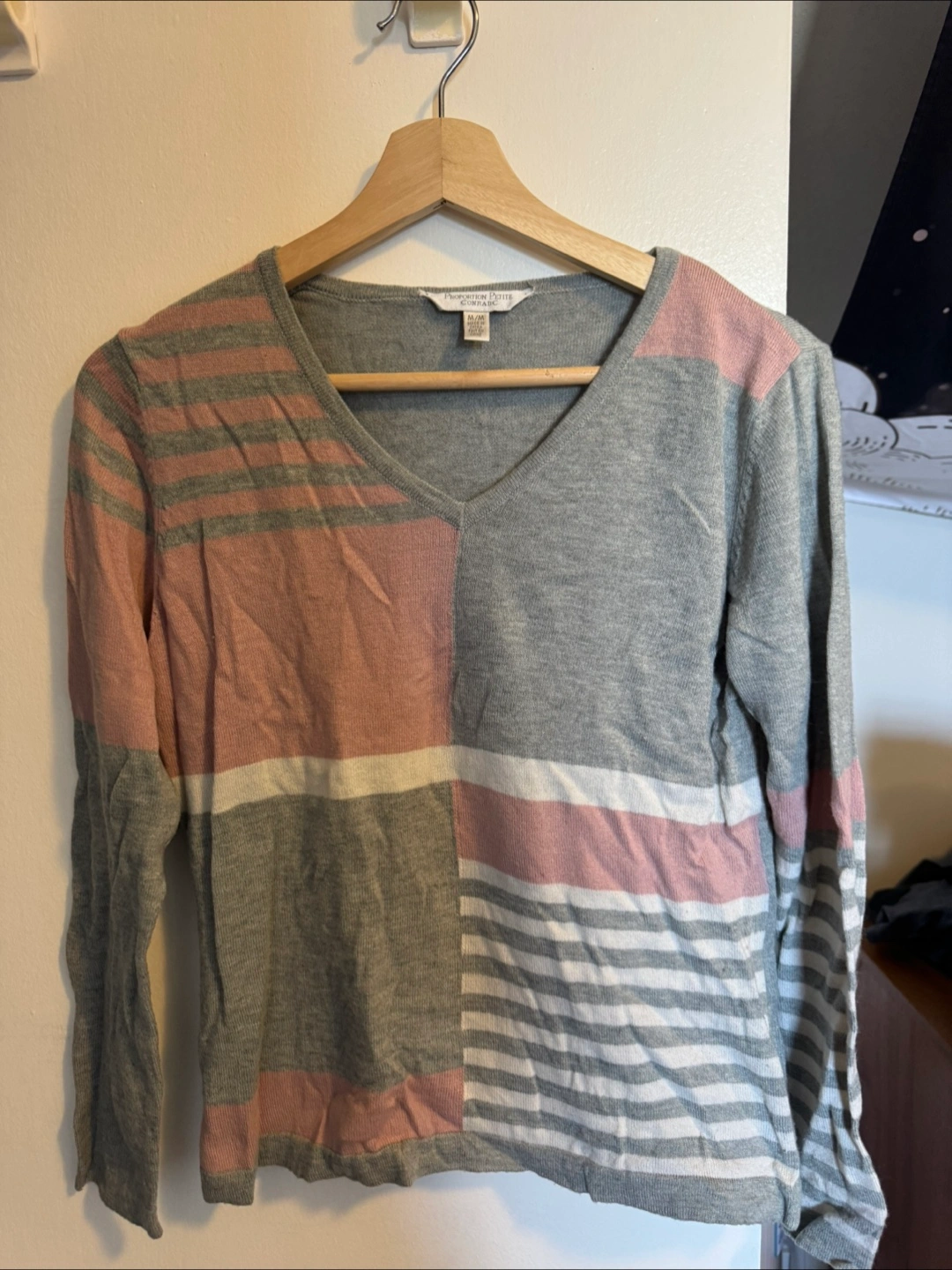 10Selling a Proportion Petite sweater in size M/10. It features a V-neck and a unique color block design in shades of grey, pink, and white. It's in great condition and ready for a new home!