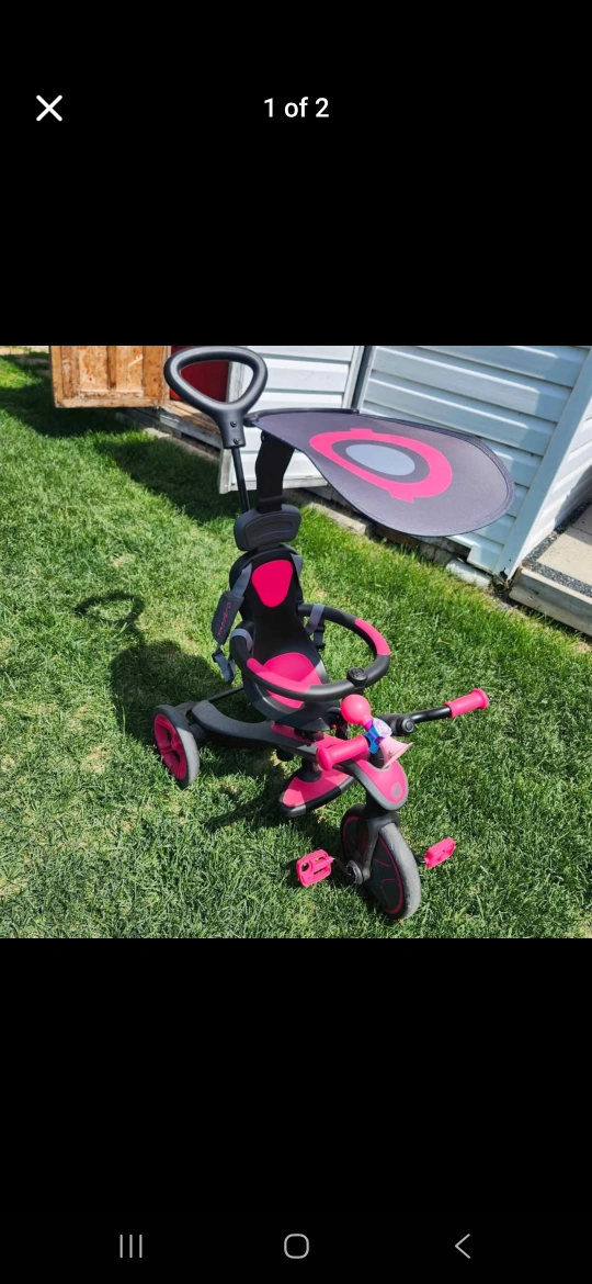 Selling a Globber Explorer 4-in-1 Trike in pink and grey! It's in great condition and ready for a new little rider. This trike adapts as your child grows, offering four different stages of use. It features a parent handle, sun canopy, and comfortable seat for enjoyable rides around the neighbourhood or at the park