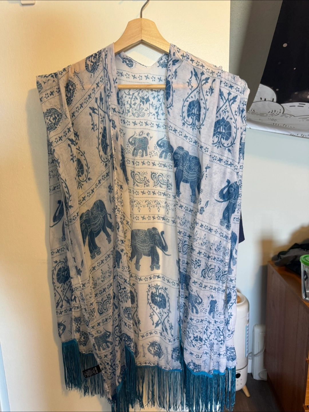 10This is a lovely scarf with an elephant print and fringe detailing! The colours are a soft white and blue. It's perfect for adding a touch of style to any outfit, no matter the weather.