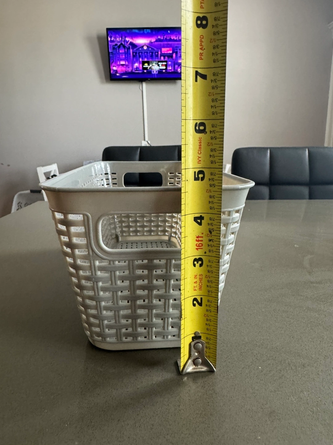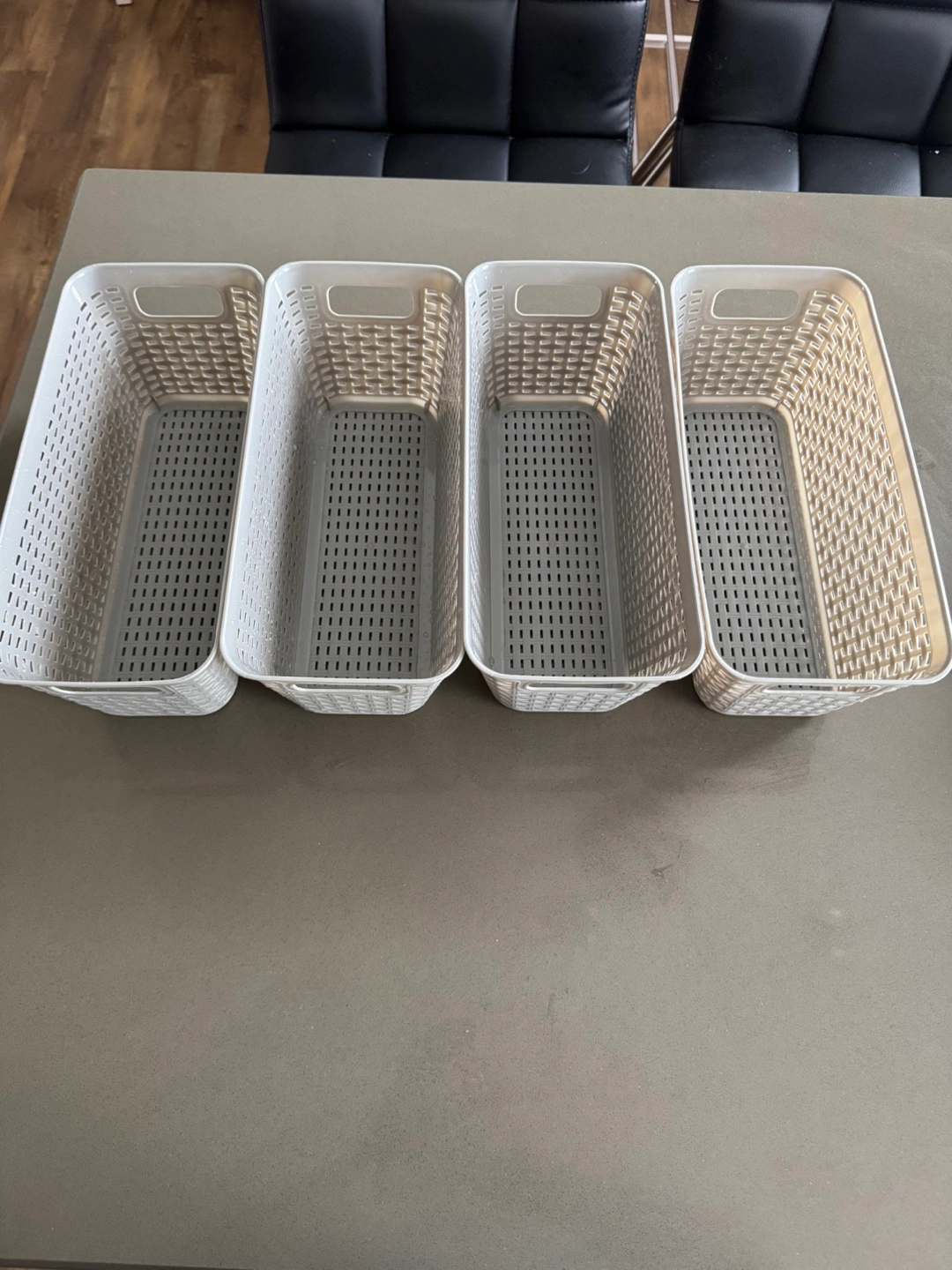 Selling four gray plastic storage baskets. They each measure approximately 11.75 inches long, 4 inches wide, and 5.5 inches tall. These are great for organizing small spaces!