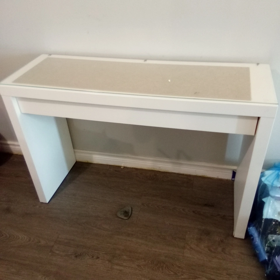101Selling a simple white desk, perfect for a small space or as a vanity. It has a smooth, glass top and a clean, minimalist design. The desk is in good condition and ready for a new home!
