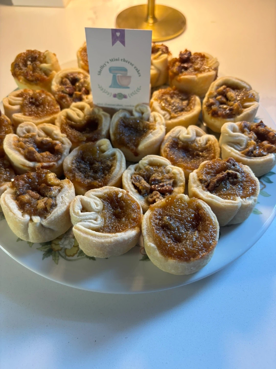 Here's a plate of delicious mini butter tarts from Shelley's Mini Cheesecake Cakes! These bite-sized treats are perfect for any occasion. They are freshly made and ready to be enjoyed! They are $12 for one dozen your choice of plain, pecan, raisin, walnut, mix and match any of the flavours together in a dozen