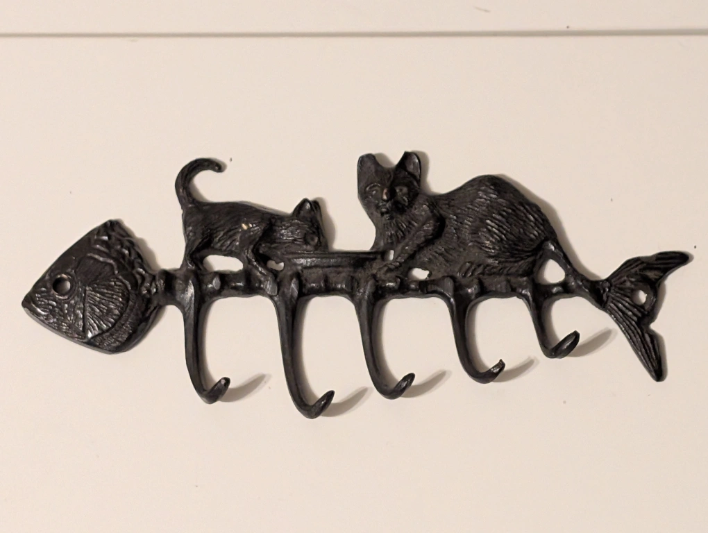 242This unique metal wall hook features a charming design of cats perched on a fishbone. Perfect for adding a touch of whimsy to your entryway, kitchen, or any room! It's sturdy and ready to hold your keys, coats, or accessories