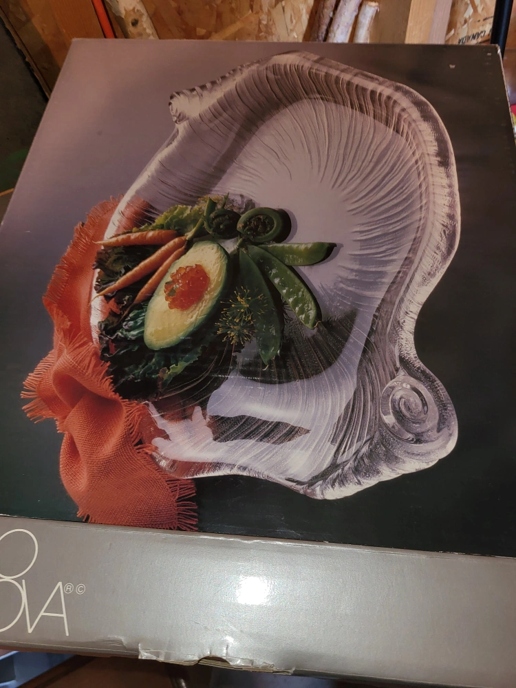 Selling a Mikasa Seashell platter. It's a beautiful, clear glass platter with a unique seashell design. The platter is 12" in diameter and model number WY061/313. Perfect for serving appetizers or desserts!