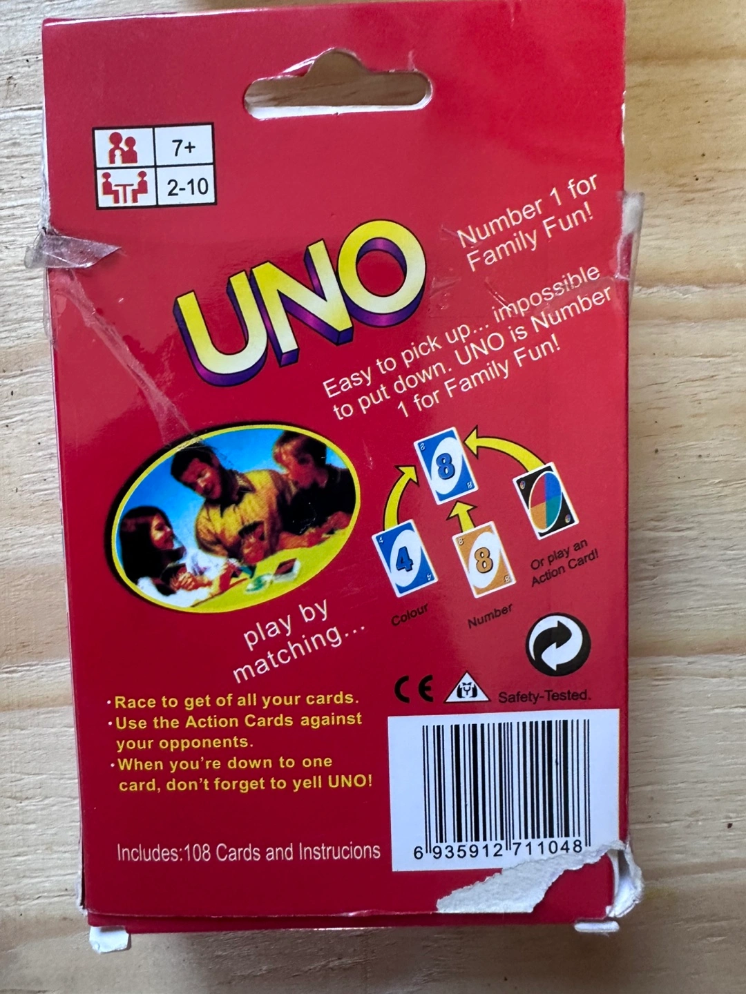 Selling a classic UNO card game, perfect for family fun! It's easy to pick up and impossible to put down. Includes 108 cards and instructions. Recommended for ages 7+ and for 2-10 players. Race to get rid of all your cards against your opponents!