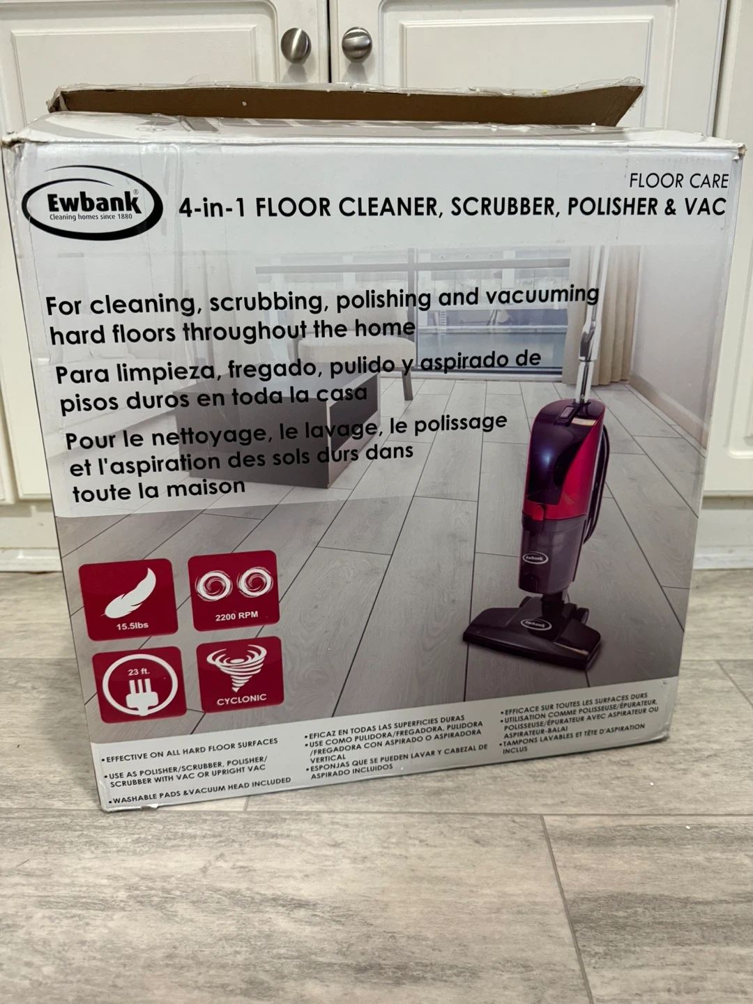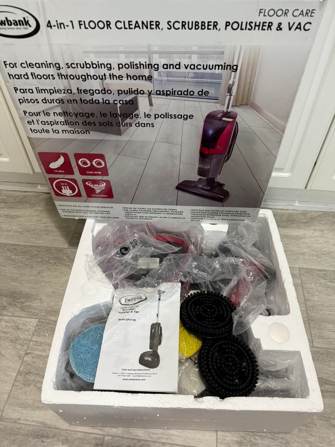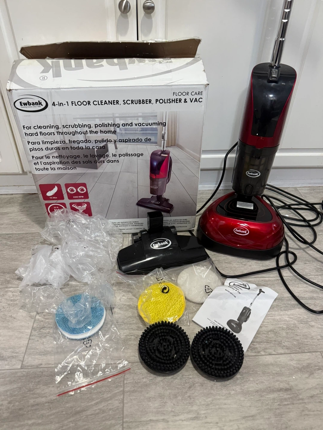 4-In-1 Floor Cleaner, Scrubber, Polisher and Vacuum Description: Model EPV1100 Cleans, scrubs, polishes and vacuums in one great machine, used only 1 single job still like new condition! Key Features: Detachable body Suitable for laminate, wood, vinyl, marble and granite Includes a full range of interchangeable pads 120 Volts Bagless Cyclonic HEPA Price: $200 Local Pickup in Westmount Delivery & Shipping Available — CLS4RD825