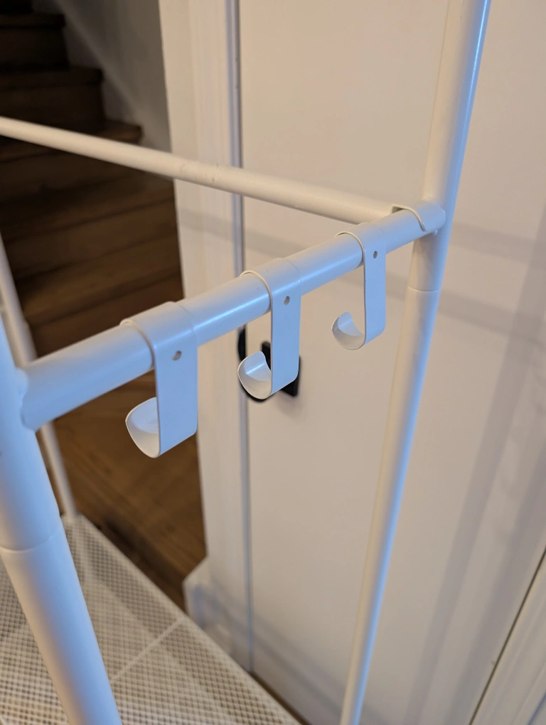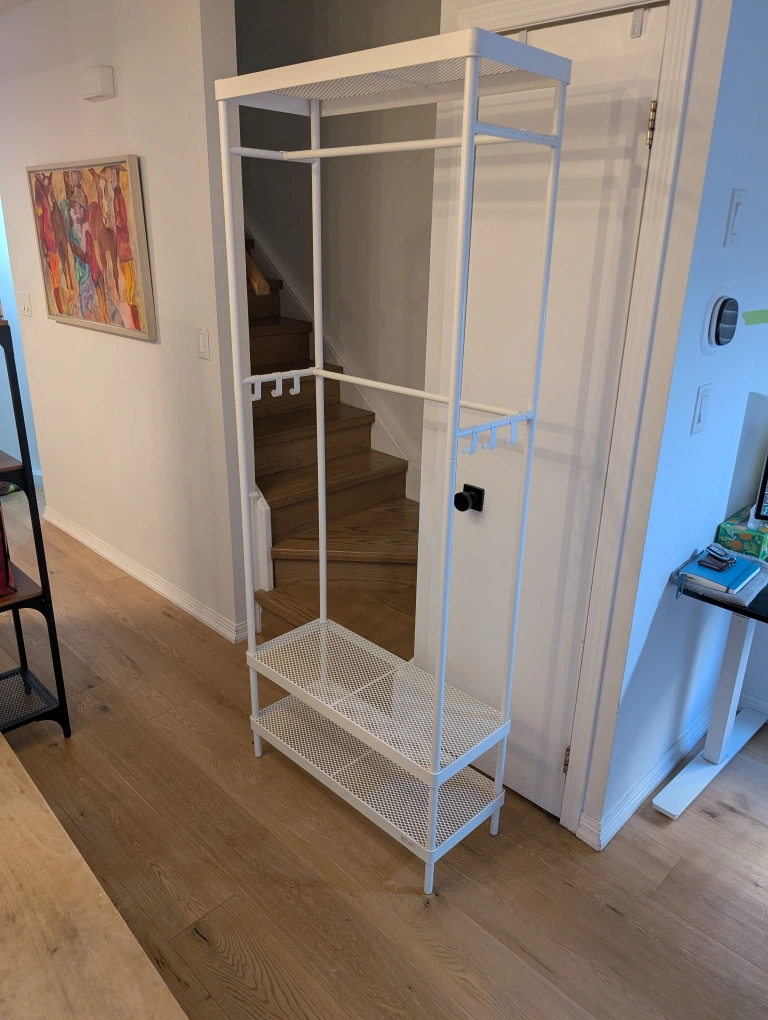 Selling an IKEA MACKAPÄR clothes rack in white. It has a simple and functional design, perfect for adding extra storage to your space. It also features hooks on the side for hanging items