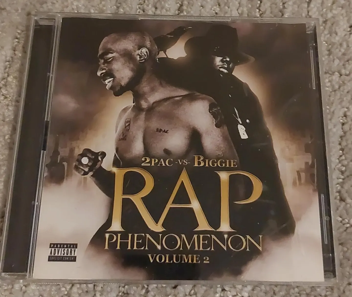 This CD features '2Pac vs. Biggie Rap Phenomenon Volume 2'. It includes explicit content, as indicated by the Parental Advisory label. This compilation offers a collection of tracks from two of hip-hop's most iconic artists. It's a great addition for any rap music enthusiast's collection.