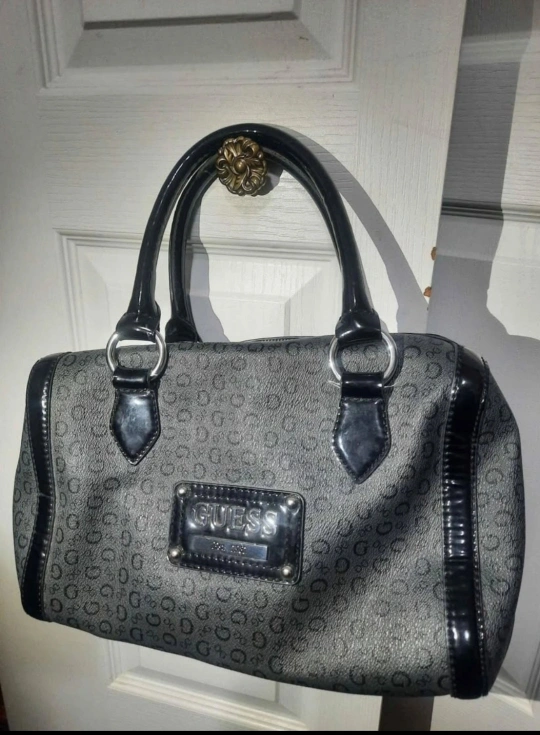 Here's a stylish Guess satchel bag in black! It features a sleek design with glossy accents and a patterned exterior. The interior has a fun leopard print lining. It's in great condition and ready for a new home