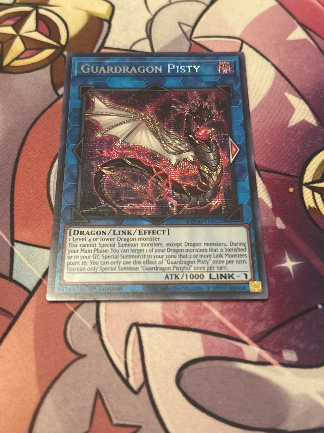 Selling a Guardragon Pisty Yu-Gi-Oh! card. It's a Dragon/Link/Effect monster with 1000 ATK and Link-1. You can only Special Summon Dragon monsters while it's in play. It also has a special ability to summon banished dragons or dragons from your GY to a zone that 2 or more Link Monsters point to!