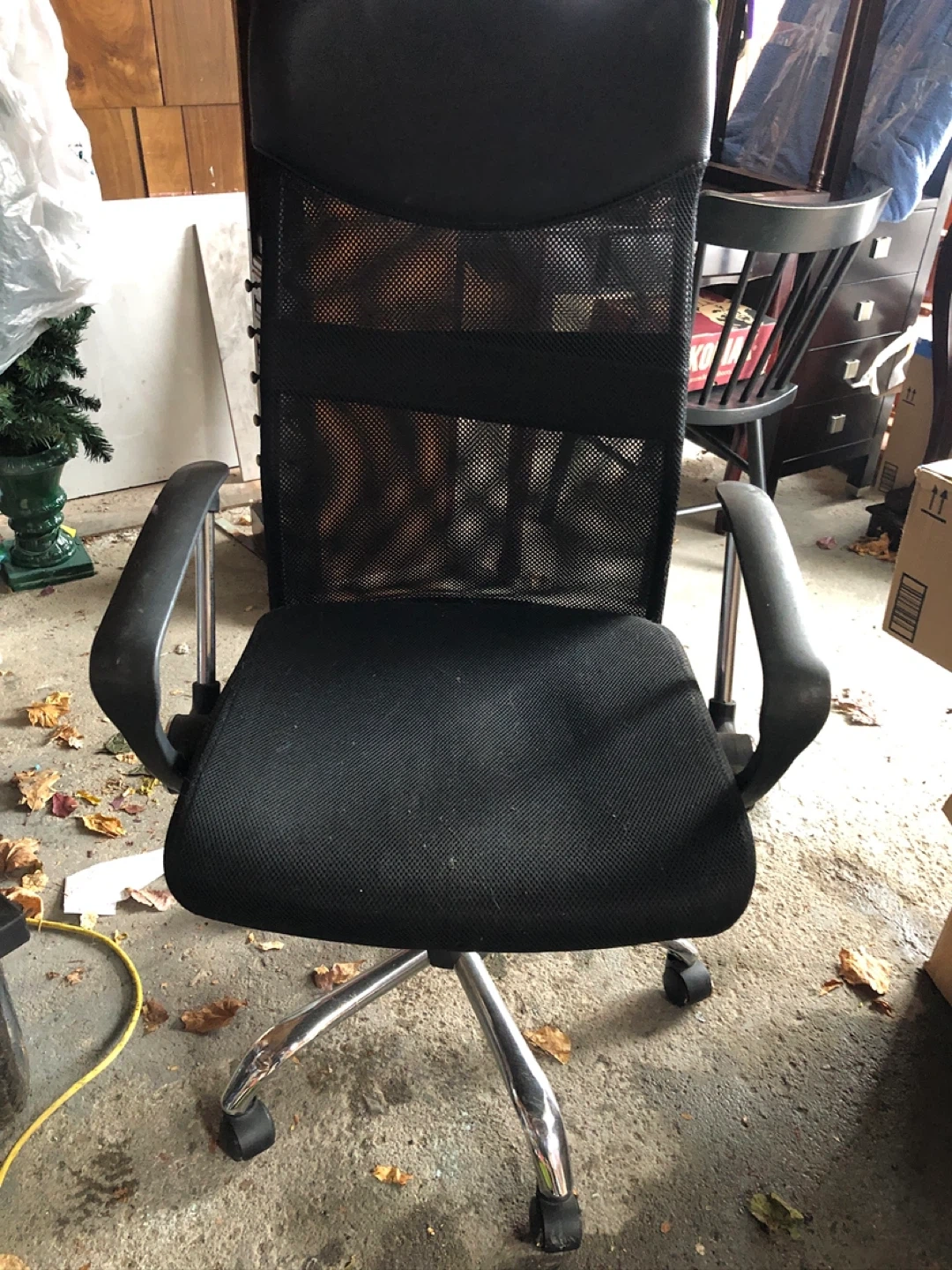 Selling a black office chair in good condition. It features a mesh back for breathability and comfortable armrests. The chair also has a sturdy base with wheels for easy movement around your workspace. Perfect for home or office use! Been sitting in garage for some time